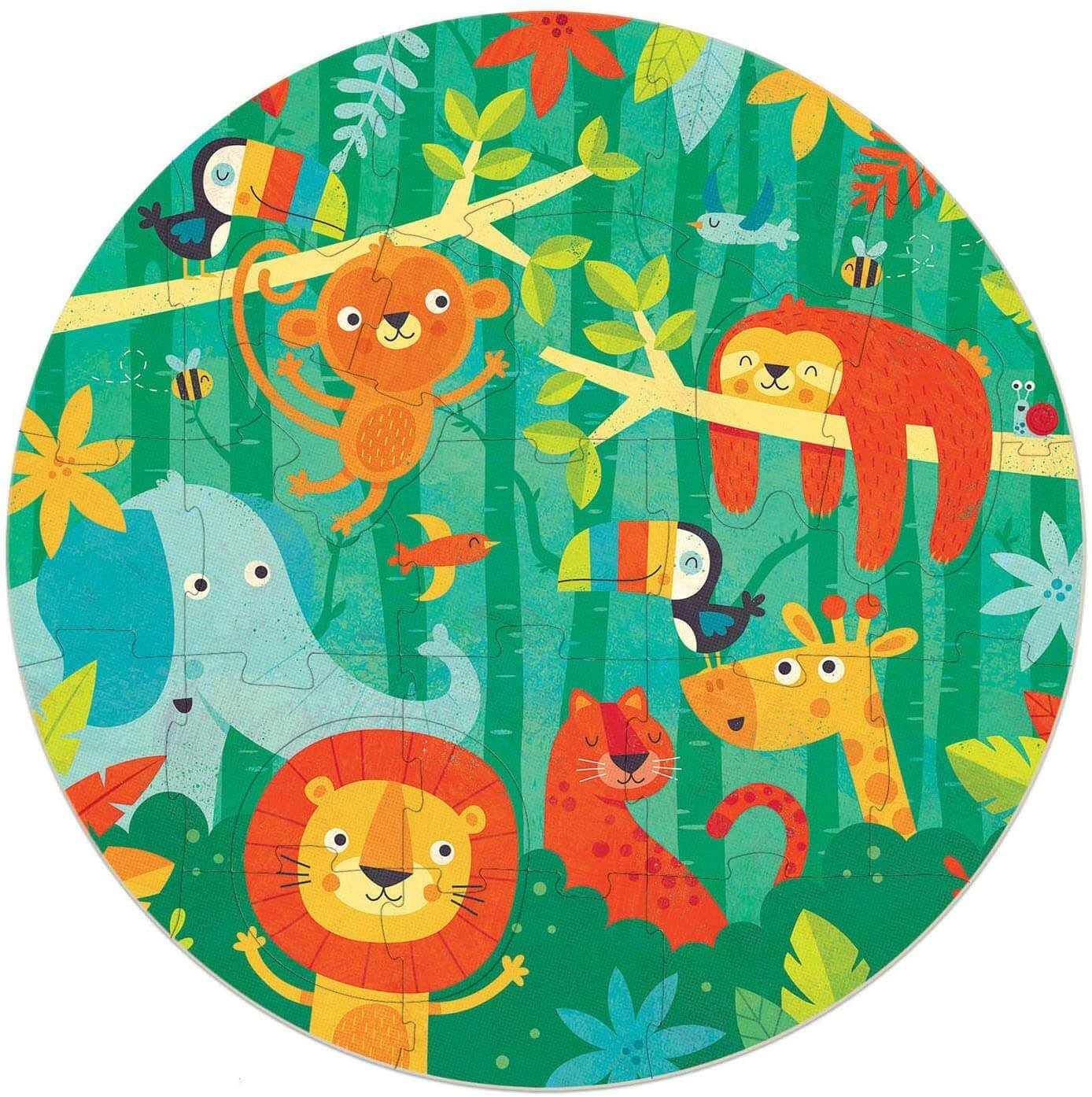 Puzzle redondo de 28 piezas y 48 cm de diámetro. Contiene tres mini puzzles extraíbles de 2 a 4 piezas y troquelados con forma especial.
