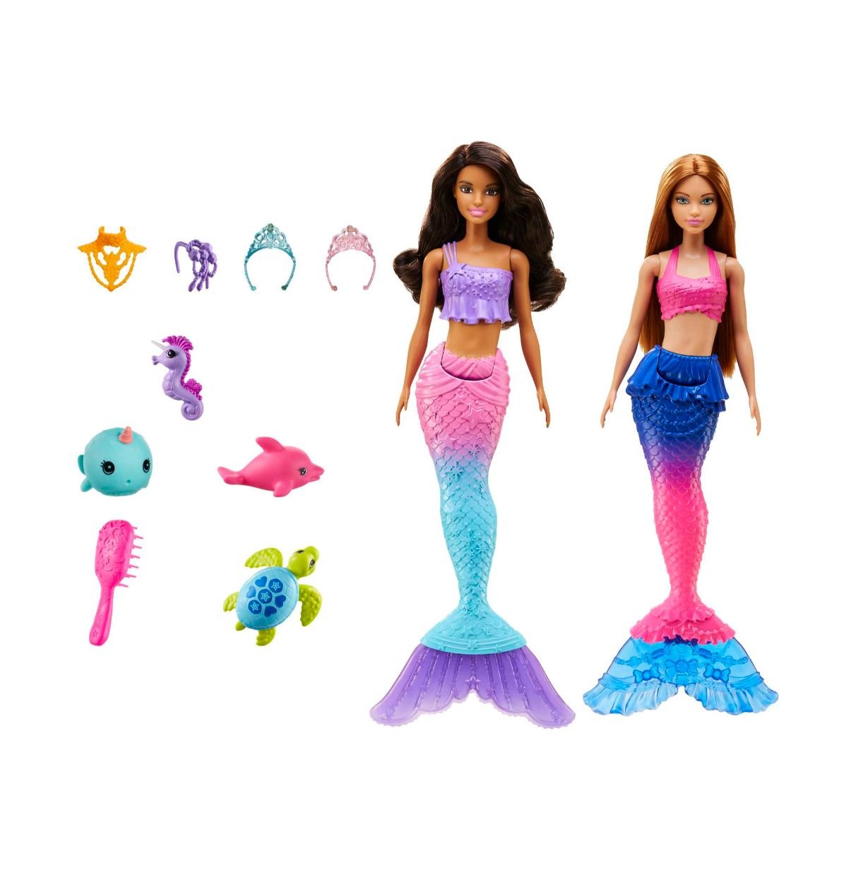 Pack de 2 Barbie Sirena. Sumerge esta hermosa muñeca Barbie sirena en el agua. Traen accesorios y animales marinos. Diviértete bajo el mar con este increíble set que incluye dos muñecas sirena Barbie® de 12 pulgadas/30,40 cm con un largo y hermoso cabello castaño. Vestidas con blusas de colores a juego y aletas de sirena, ¡estas muñecas de sirena hacen una declaración llamativa! El set también viene con 4 mascotas oceánicas (algunas chorras de agua) más 2 tiaras, una diadema, un collar y un cepillo para olas de diversión oceánica. Edad recomendada: +3 años.