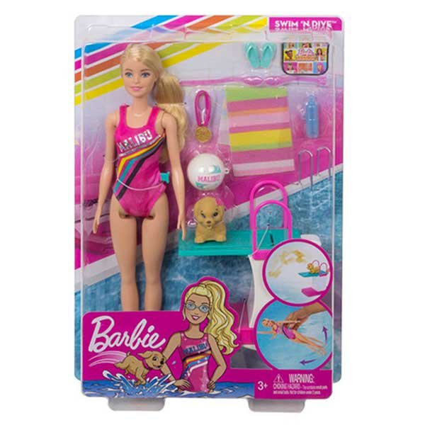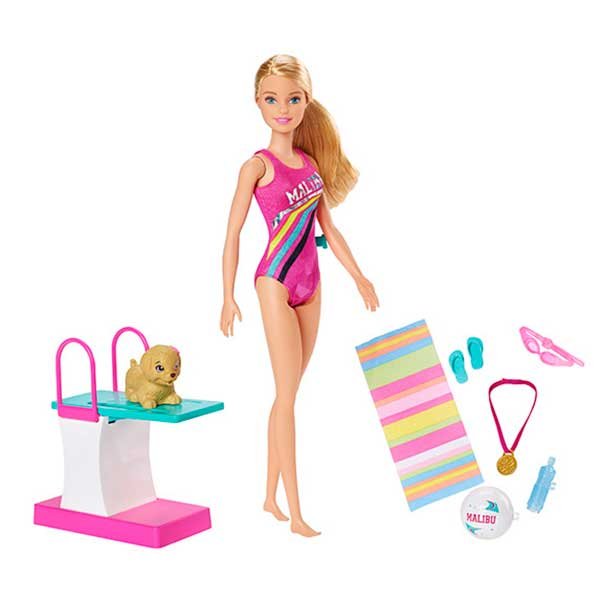 Coloca el cachorrito de Barbie® en el trampolín para ver cómo da vueltas o llénalo de agua y aprieta. ¡Puedes usarlo como juguete que lanza chorritos! Las oportunidades de crear historias son infinitas: ponle a Barbie® las gafas de bucear y practica el salto perfecto desde el trampolín o juega con la pelota de waterpolo. Cuando te canses de chapotear, ponle el accesorio de medalla y relájate con una botella de agua, sandalias y una toalla.
