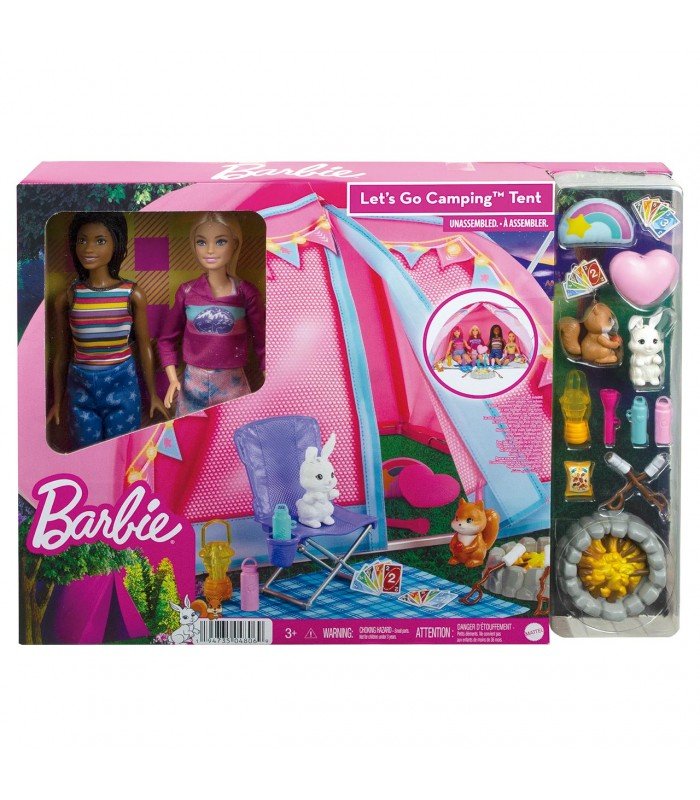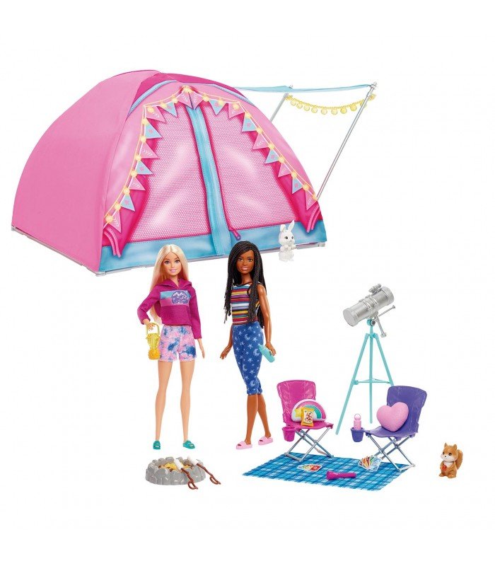 Consigue este impresionante pack que incluye dos muñecas muy especiales, dos animalitos preciosos y una tienda de campaña sensacional, con la que disfrutar de noches al aire libre inolvidables. ¡Revive momentos mágicos junto a Barbie y Brooklyn! ¡Pásalo genial imaginando historias sin igual!