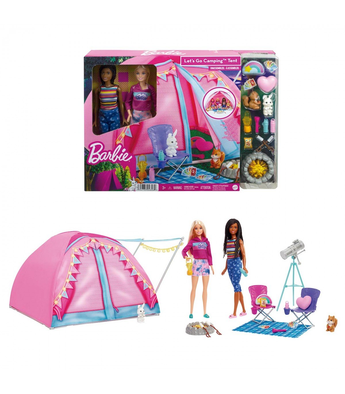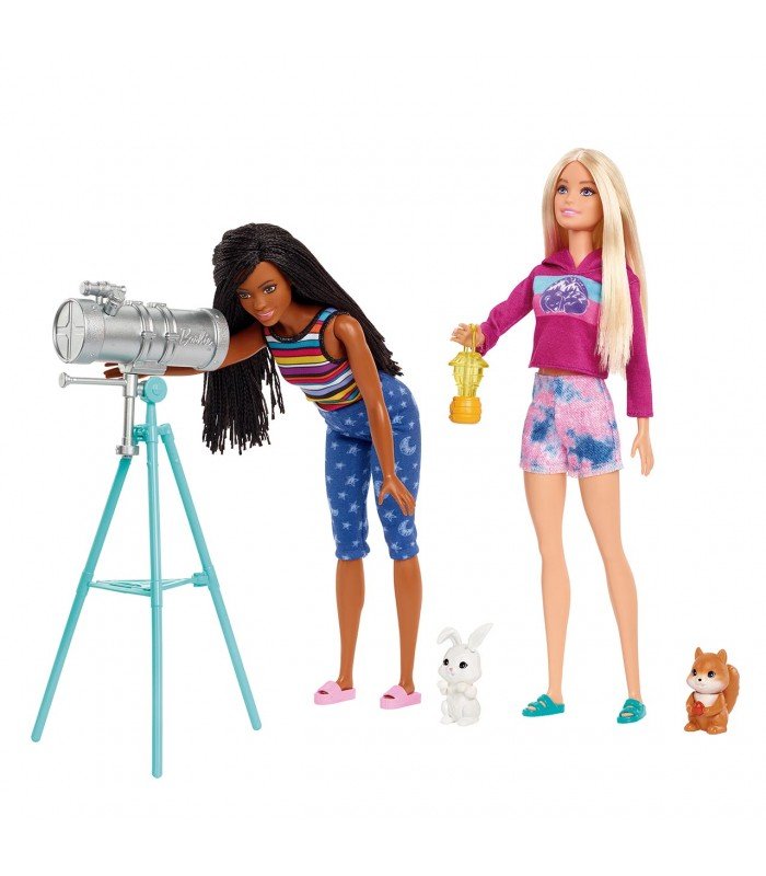 Incluye: 1 muñeca Barbie con sudadera rosa, pantalón rosa y azul y chanclas azules, 1 muñeca Brooklyn con camiseta multicolor, pantalón azul y chanclas rosas, 1 tienda de campaña, 1 figura conejito, 1 figura ardilla, 2 sillas con portavasos, 1 hoguera, 2 termos, 1 linterna, 1 lucero, cartas y muchos más accesorios.
