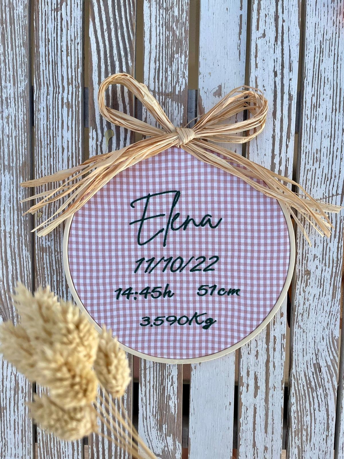 Es un artículo decorativo realizado en un bastidor de madera de 20,5 cm y con rafia 100% natural. Se puede personalizar tanto la tela como el hilo del bordado, que debe de indicarse en notas del pedido.