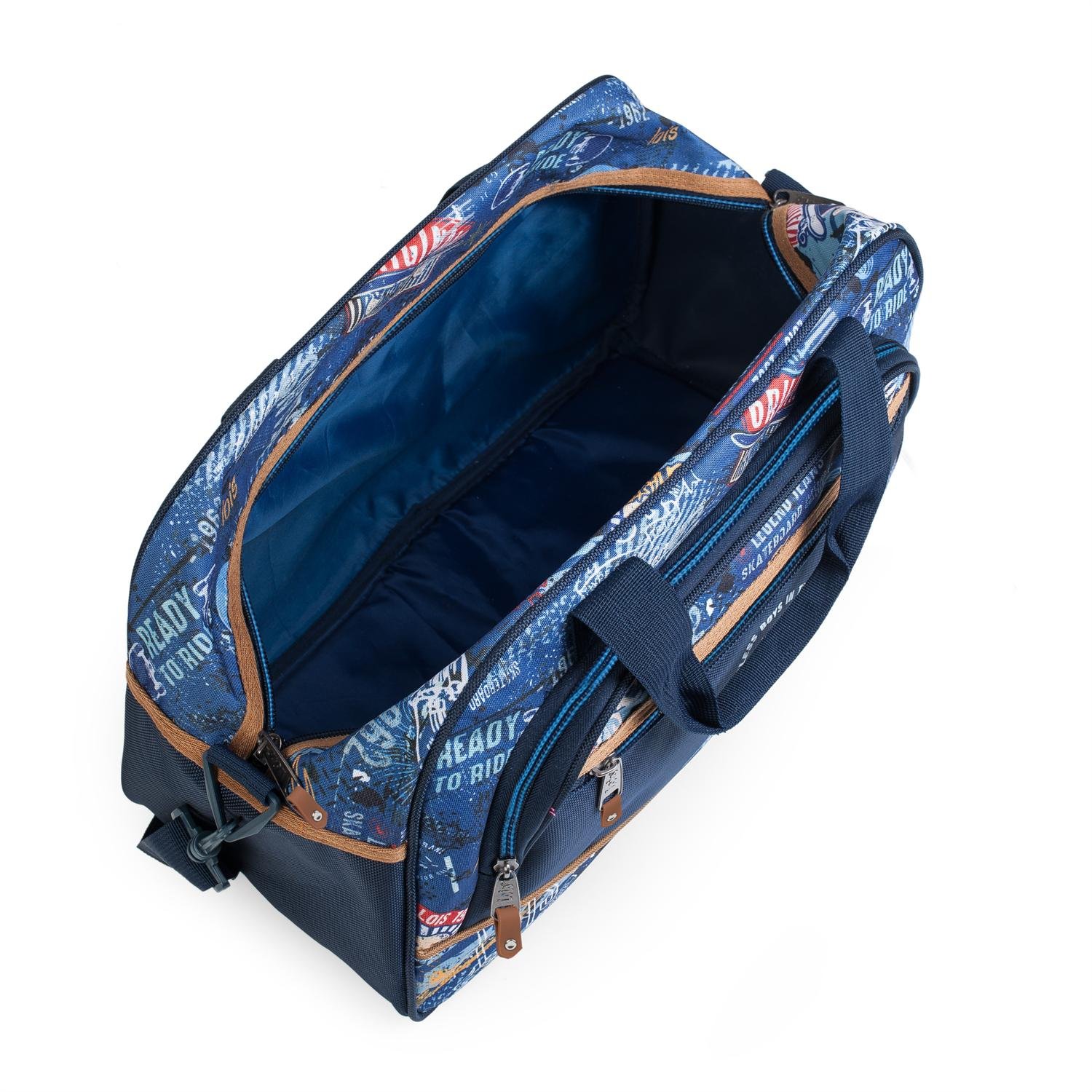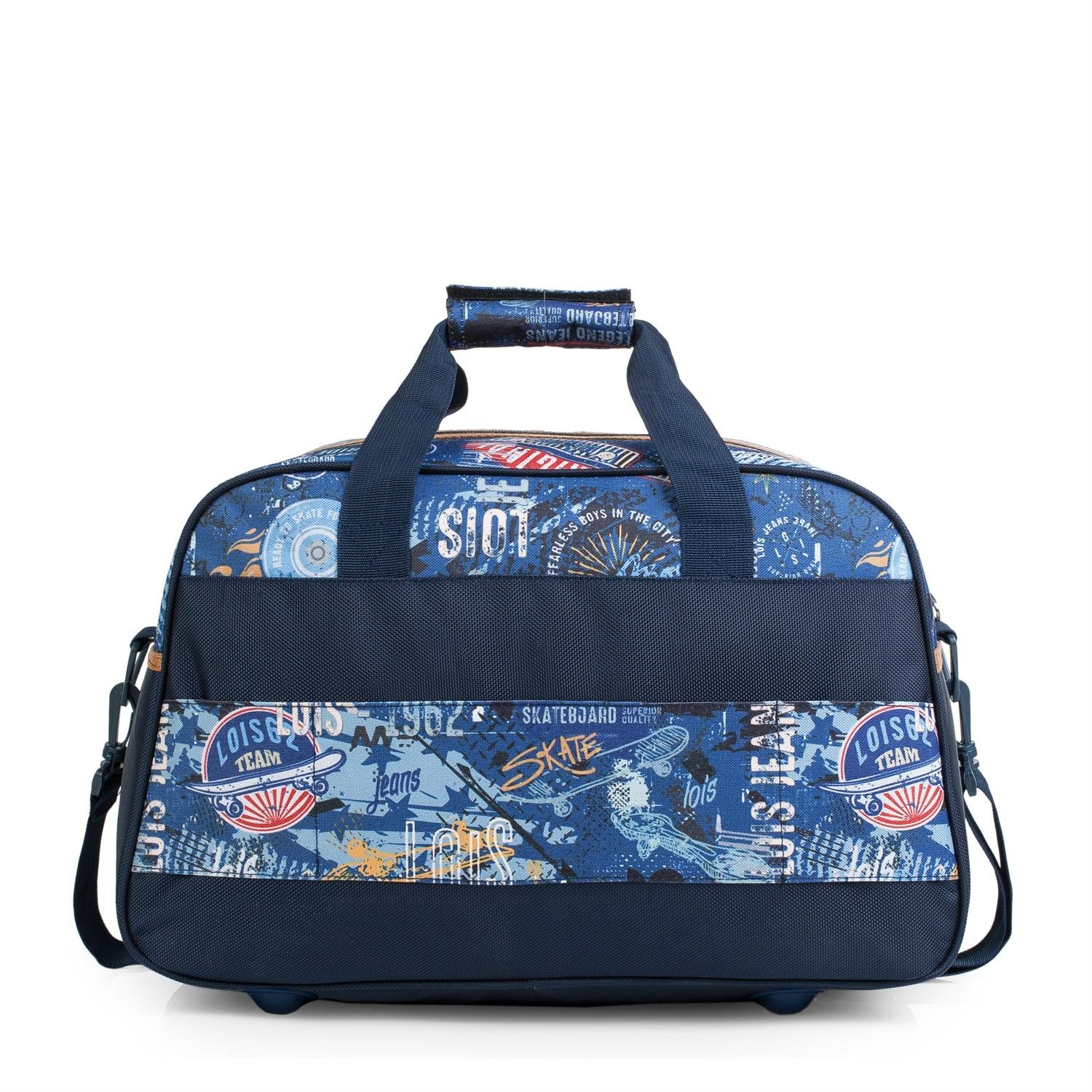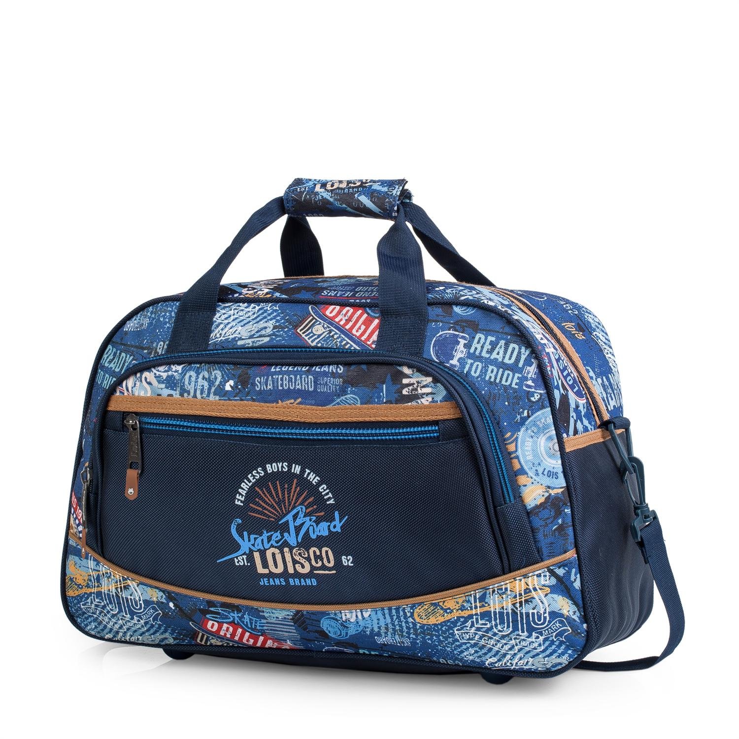Bolsa de la marca LOIS fabricada en poliéster. Tiene doble asa y una bandolera adicional ajustable para su transporte. Con dos compartimientos en la parte frontal con cierre cremallera. Base reforzada con cuatro patas auxiliares.