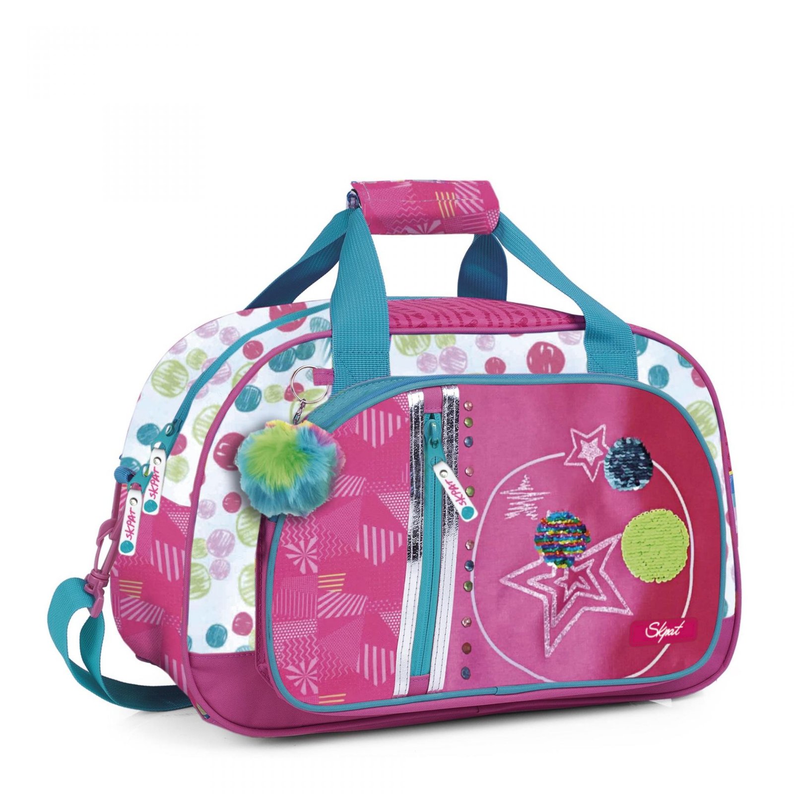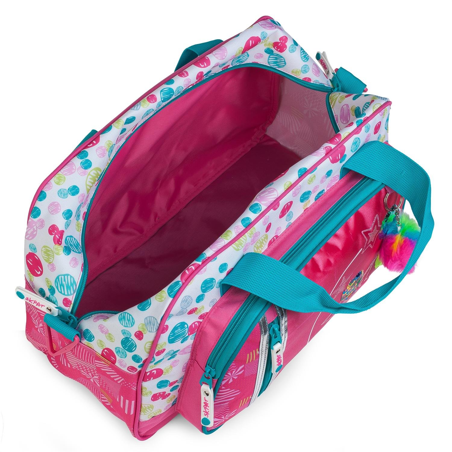 Bolsa de la marca SKPAT fabricada en poliéster y satén. Tiene doble asa y una bandolera adicional ajustable para su transporte. Con dos compartimientos en la parte frontal con cierre cremallera y una banda adaptable al carro de la maleta. Base reforzada con cuatro patas auxiliares. Lleva un llavero pompón multicolor.