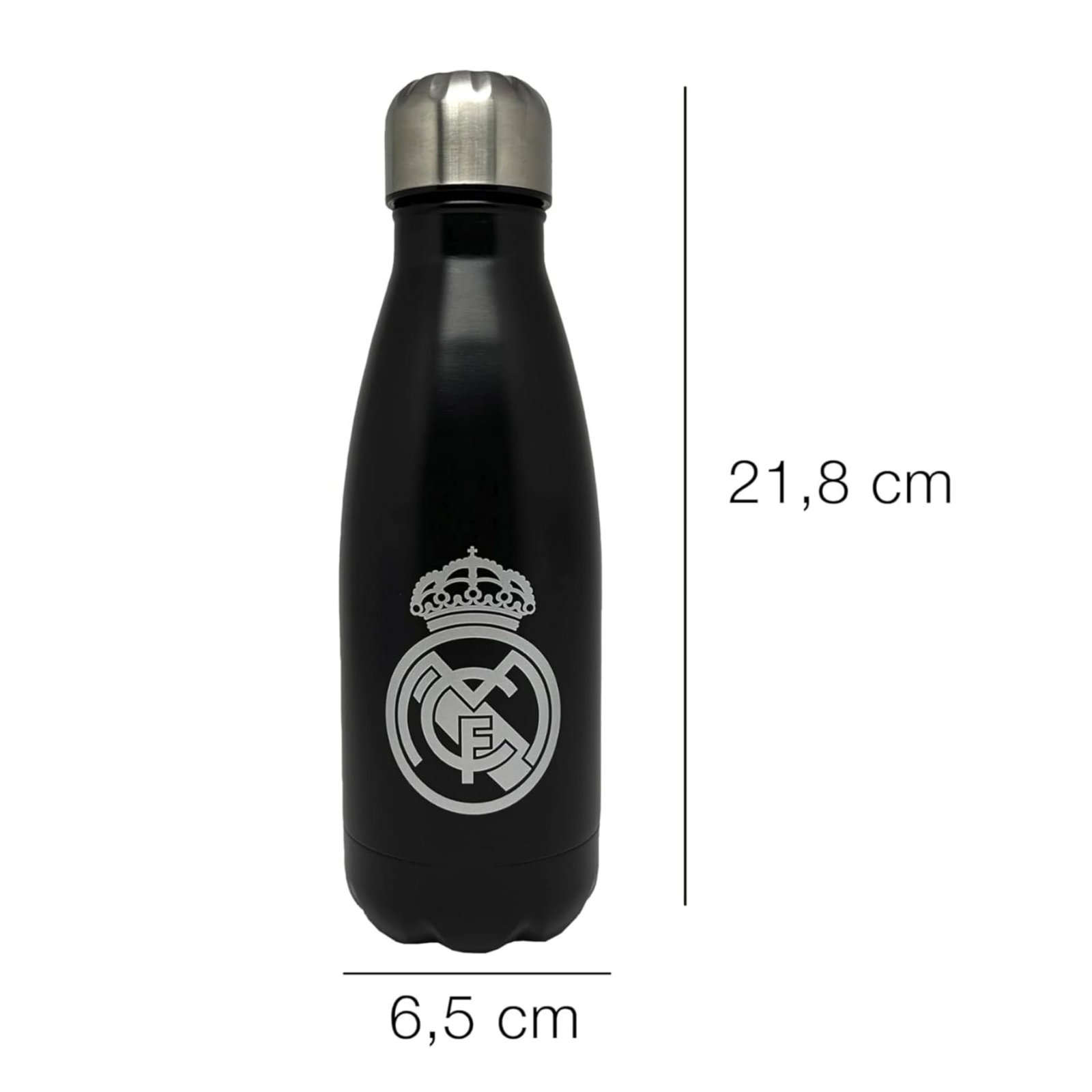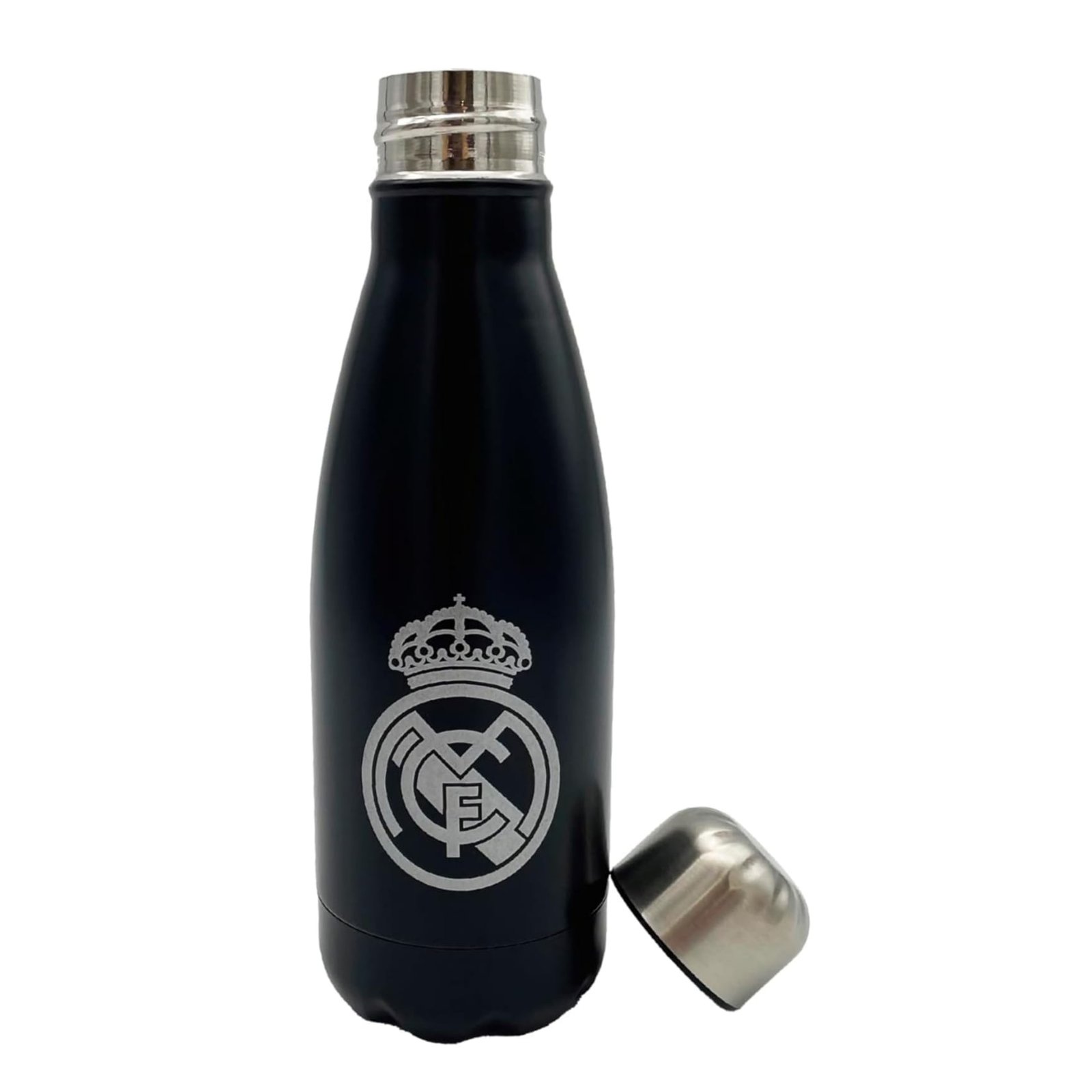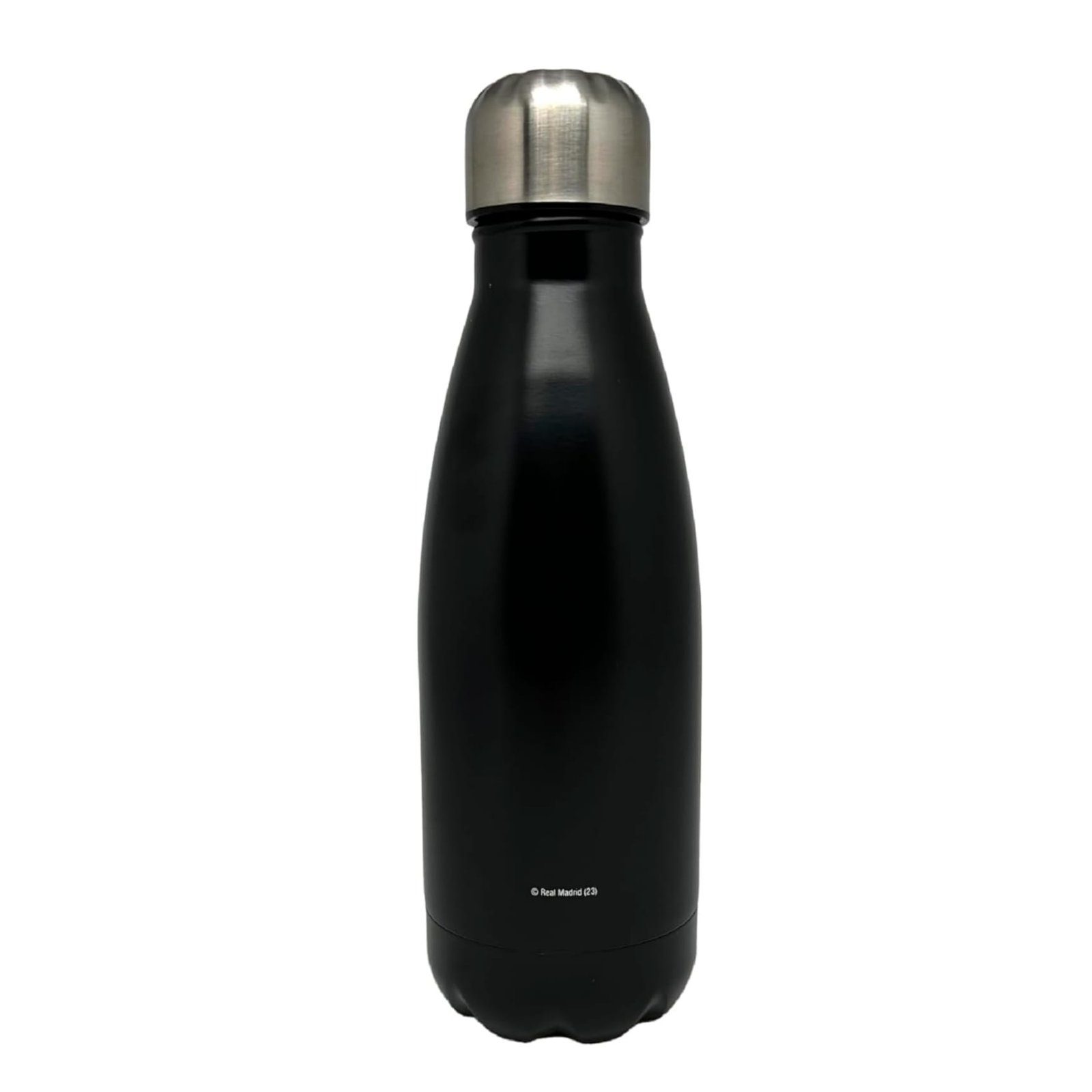 Botella térmica del Real Madrid de acero inoxidable con diseño negro elegante. Mantiene bebidas frías o calientes. Reutilizable, resistente y regalo ideal para fans.