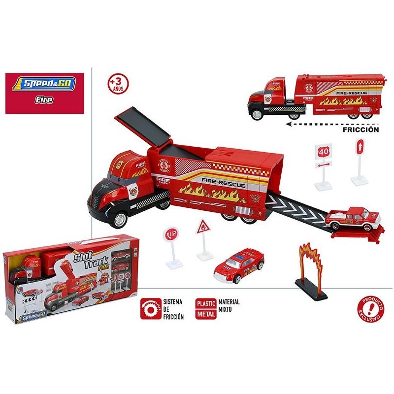 Camion de bomberos Transportador con sistema de fricción. Incluye 2 vehículos de bomberos y señales. Además su cajón transportador se puede convertir en pista deslizante para los vehículos que incluye en su interior.
