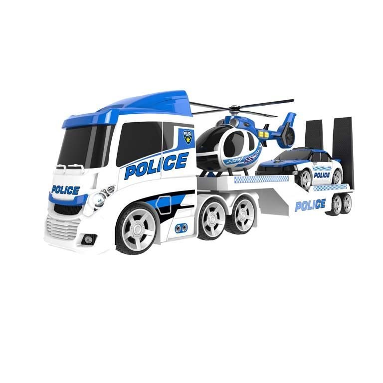 Camión De Transporte De Policía. Con el que los más peques se pondrán en la piel de un policía y vivirán multitud de aventuras de rescate, luchando por ayudar a los demás. El Camión transportador incluye un helicóptero de policía con sonido y luz, un coche de bomberos con sonidos. Requiere 3 pilas (AAA) incluidas de demostración