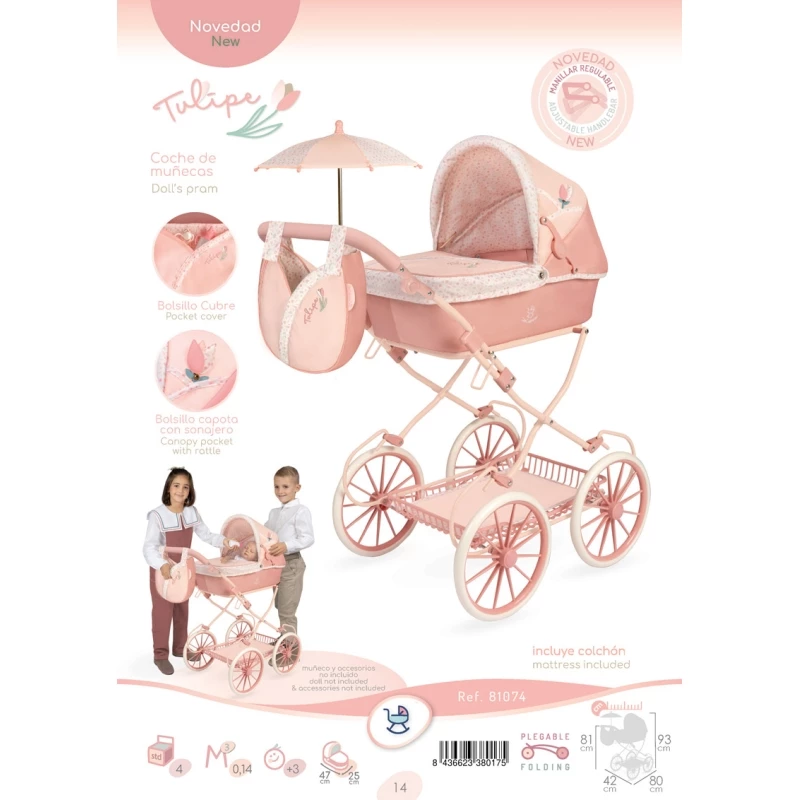 Este encantador cochecito Tulipe de DeCuevas Toys combina elegancia y diversión. Su diseño en tonos rosas suaves con detalles florales es ideal para niños y niñas que disfrutan del juego simbólico cuidando a sus muñecos 💐✨
