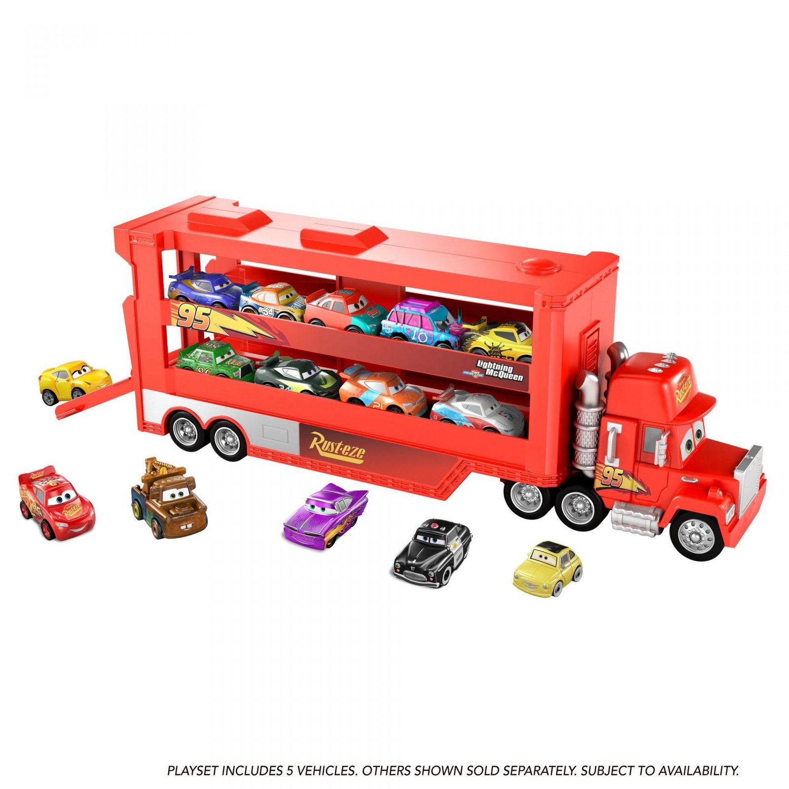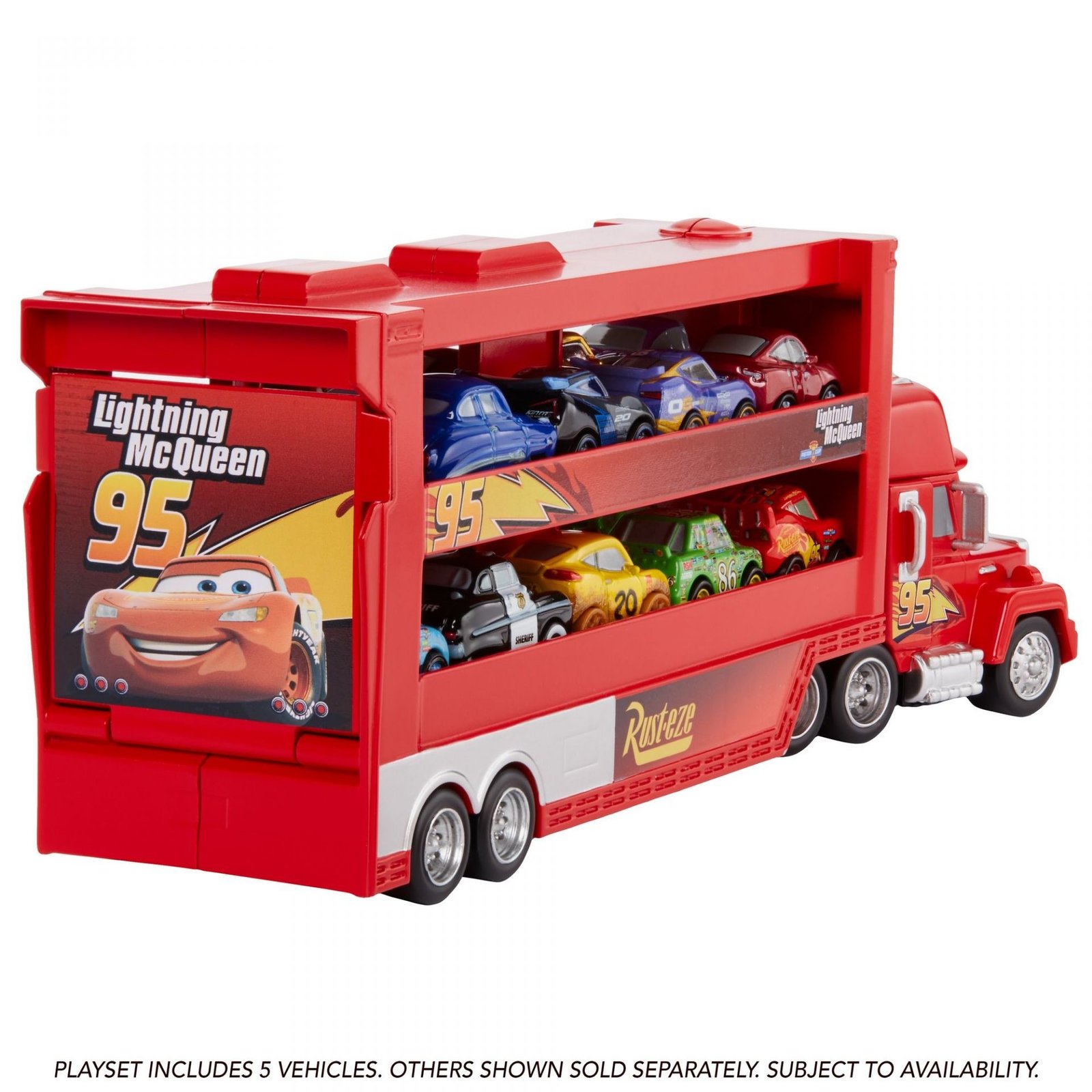 Completo pack de juego de Cars de Disney y Pixar con 5 minivehículos y un minicamión Mack. Un pack perfecto para contar historias y para organizar sobrecogedoras carreras. La puerta lateral del camión se abre para cargar y descargar los coches fácilmente. Un juguete ideal para jugar empujándolo, para hacer carreras y para imaginar aventuras. Incluye a Rayo McQueen, Sheriff, Luigi, Mater y Ramón. ¡Y el camión Mack tiene espacio para 11 vehículos más!