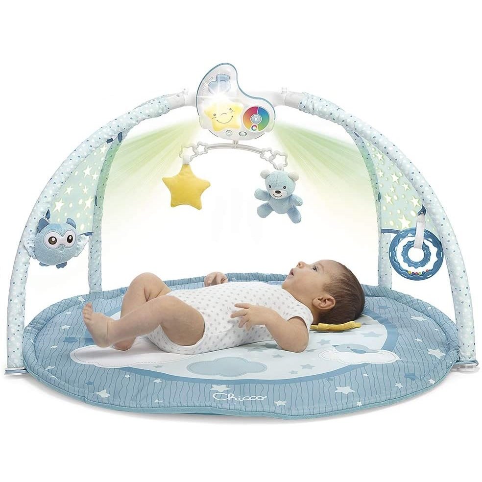 Gimnasio 3 en 1 para bebés con melodías y proyecciones coloridas inspiradas en la cromoterapia. De 83cm de diámetro, este gimnasio para bebés tiene diferentes melodías y proyecciones para estimular al bebé. Cuanta con 30 minutos de melodías clásicas (Mozart y Grieg), jazz y New Age, interruptor del temporizador(ciclo de 15 o 30 minutos de música y luces) y elementos para jugar: 1 almohada, 2 colgantes textiles, 1 sonajero de plástico con anillo, 1 sonajero textil.