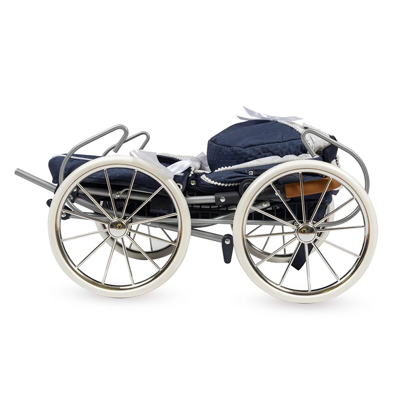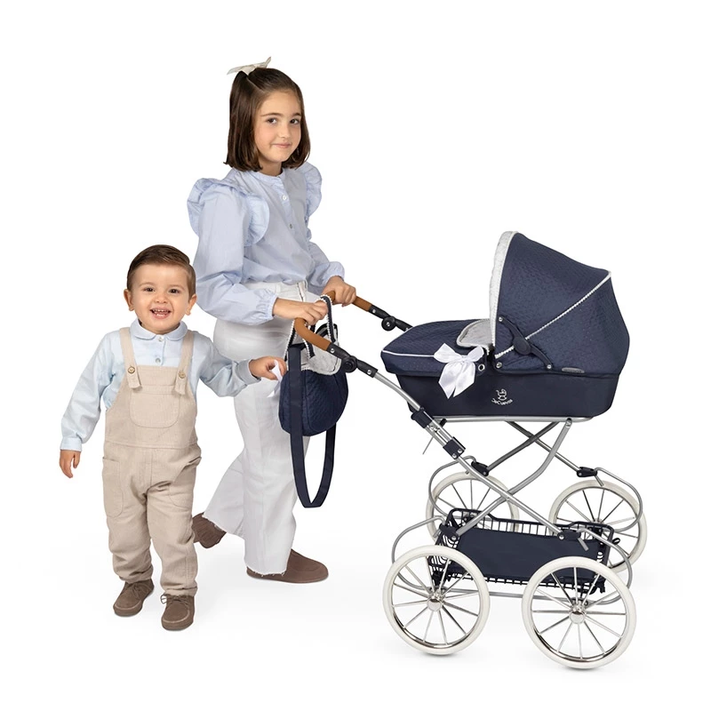 El Coche de Muñecas Vintage de DeCuevas Toys combina la elegancia de los cochecitos tradicionales con la comodidad de un diseño actual y funcional. Su precioso tono azul marino con detalles blancos y lazo satinado lo convierten en una joya para peques amantes del juego simbólico y del cuidado 🧸💞