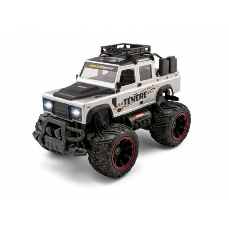 Monster truck 1/14 con carrocería ABS para mejor acabado y detalle del chasis, con baca de carga Africana, depósitos auxiliares, estriberas rock sliders, planchas arena, pala. Con luces potentes para jugar también en la oscuridad. Equipo de radio de 2,4 G