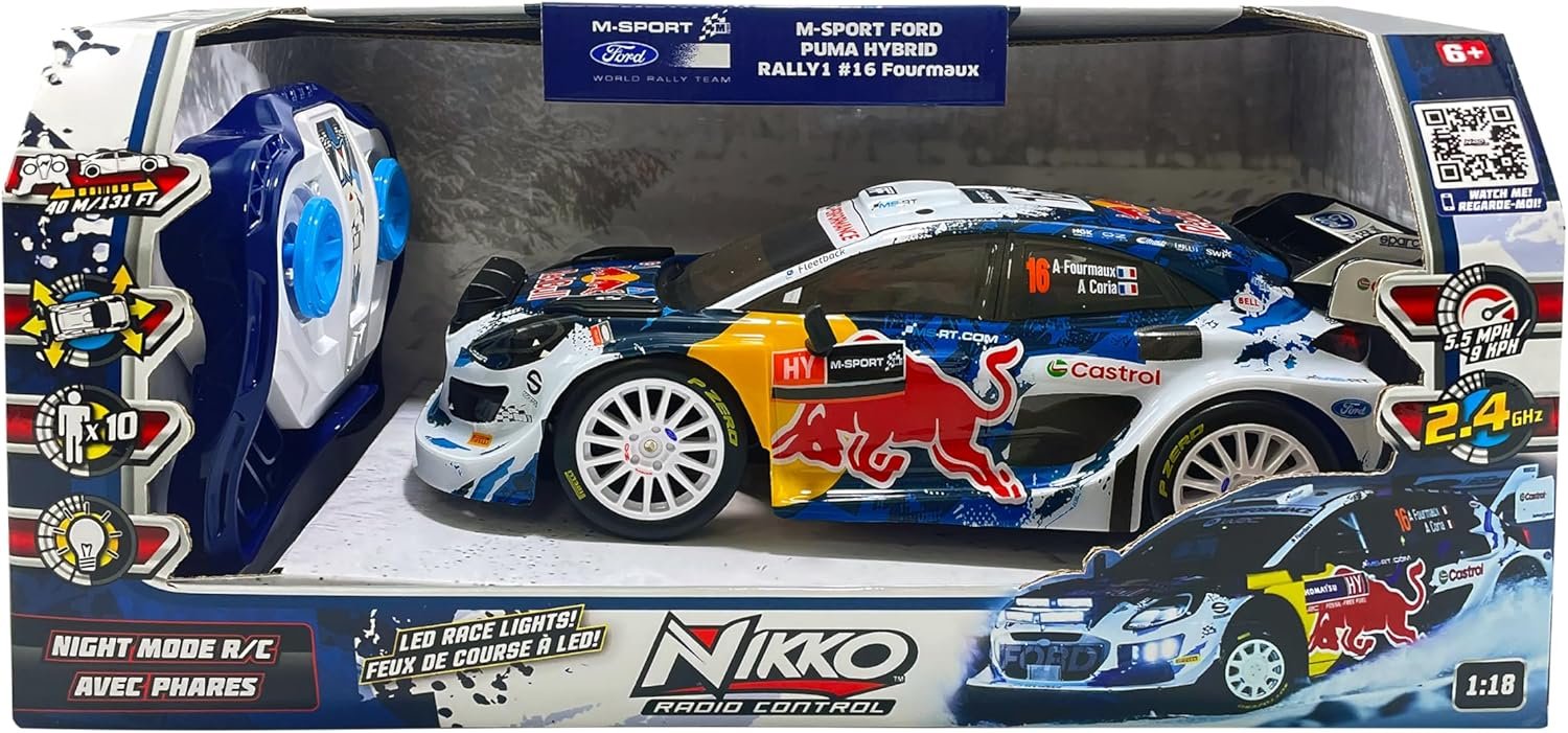 Disfruta del coche radiocontrol Nikko Ford Puma Hybrid Rally1 #16 con luces LED, escala 1:18 y tecnología 2.4 GHz. Velocidad de 9 km/h, apto para niños y niñas desde 6 años. ¡Diversión, realismo y potencia en un solo vehículo RC!