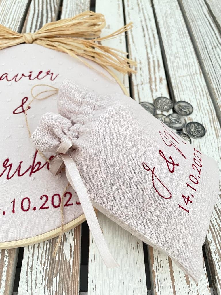 Bastidor de 24cm personalizado de arras. Bolsa compañera con el mismo tejido e hilo del bordado.