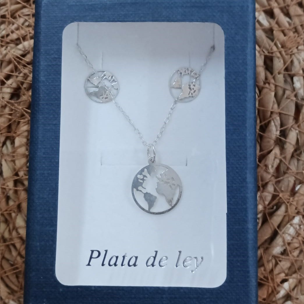 Conjunto plata ley pendientes y colgante mapa mundi
