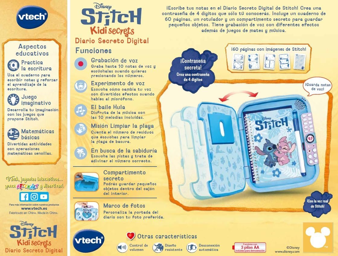 Descubre el Diario Secreto Digital Stitch de VTech: con contraseña, grabación de voz, actividades educativas y cuaderno incluido. Ideal para peques creativos. Funciona con 3 pilas AA. Envío rápido.