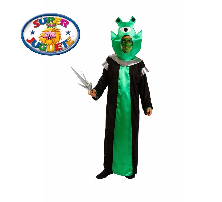 Disfraz de alien verde para niño con túnica larga y casco con ojo gigante. Ideal para Halloween, carnaval y fiestas temáticas.