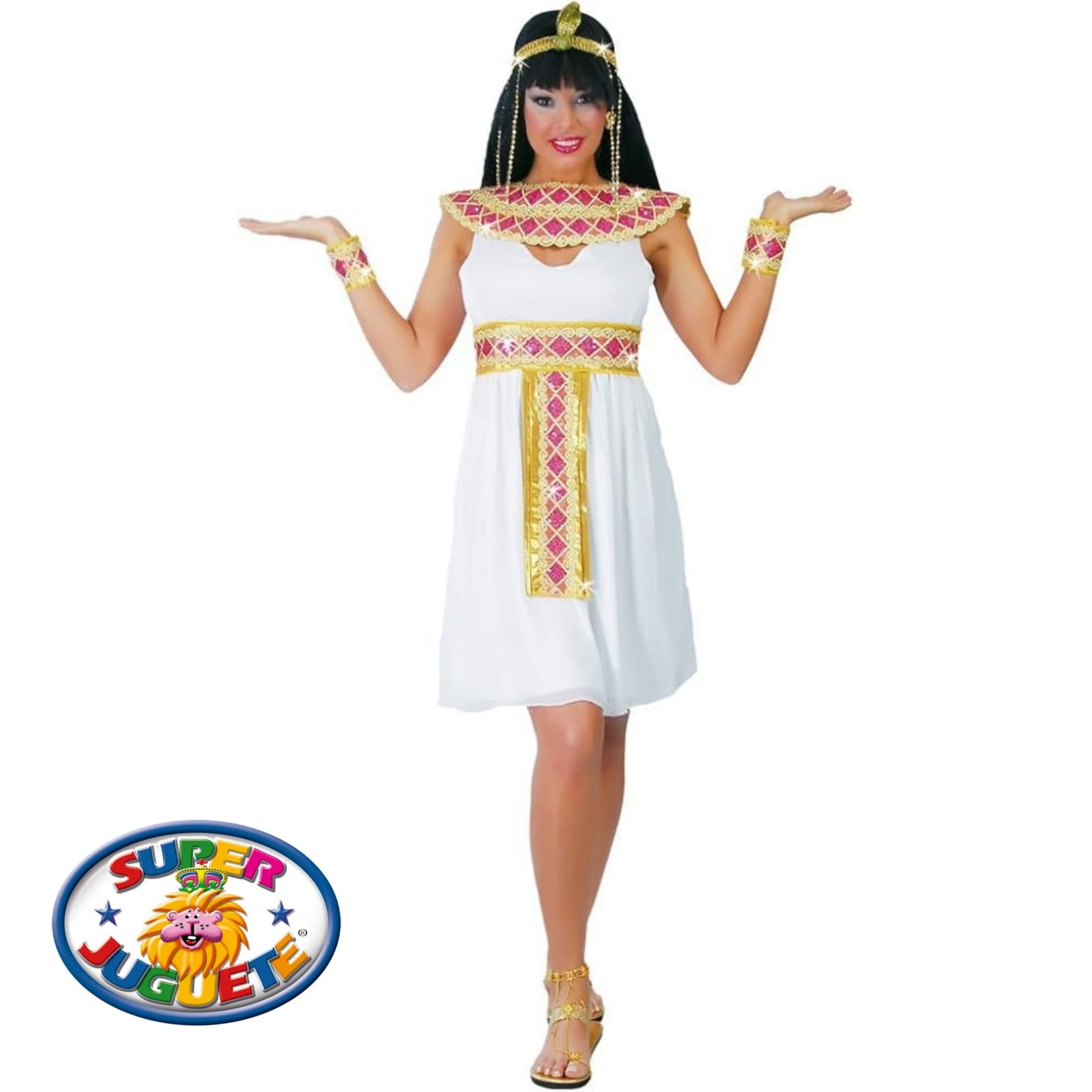 Disfraz de Reina Egipcia corta para adultos con vestido blanco, detalles dorados y tocado. Ideal para Carnaval, Halloween y fiestas temáticas. No necesita pilas.