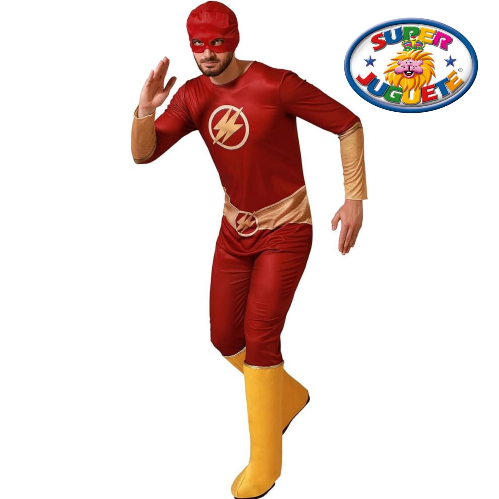 Con este disfraz de superhéroe veloz, te convertirás en el protagonista más rápido de cualquier fiesta. Su mono rojo con detalles dorados y símbolo de rayo transmite energía, poder y espíritu heroico en cada paso ⚡🔥.