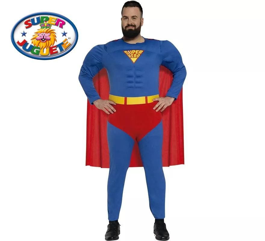 Disfraz de superhéroe musculoso para adulto con mono azul, capa roja y cinturón amarillo. Ideal para Carnaval, Halloween y fiestas temáticas. Look poderoso y divertido.