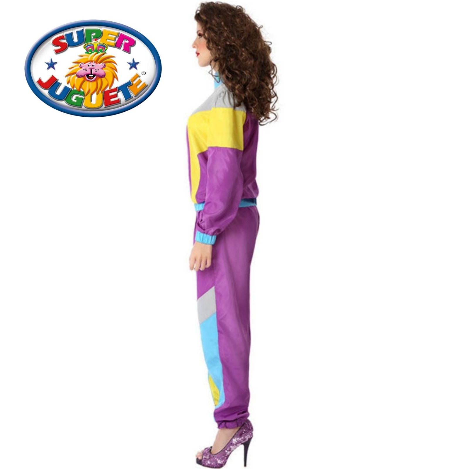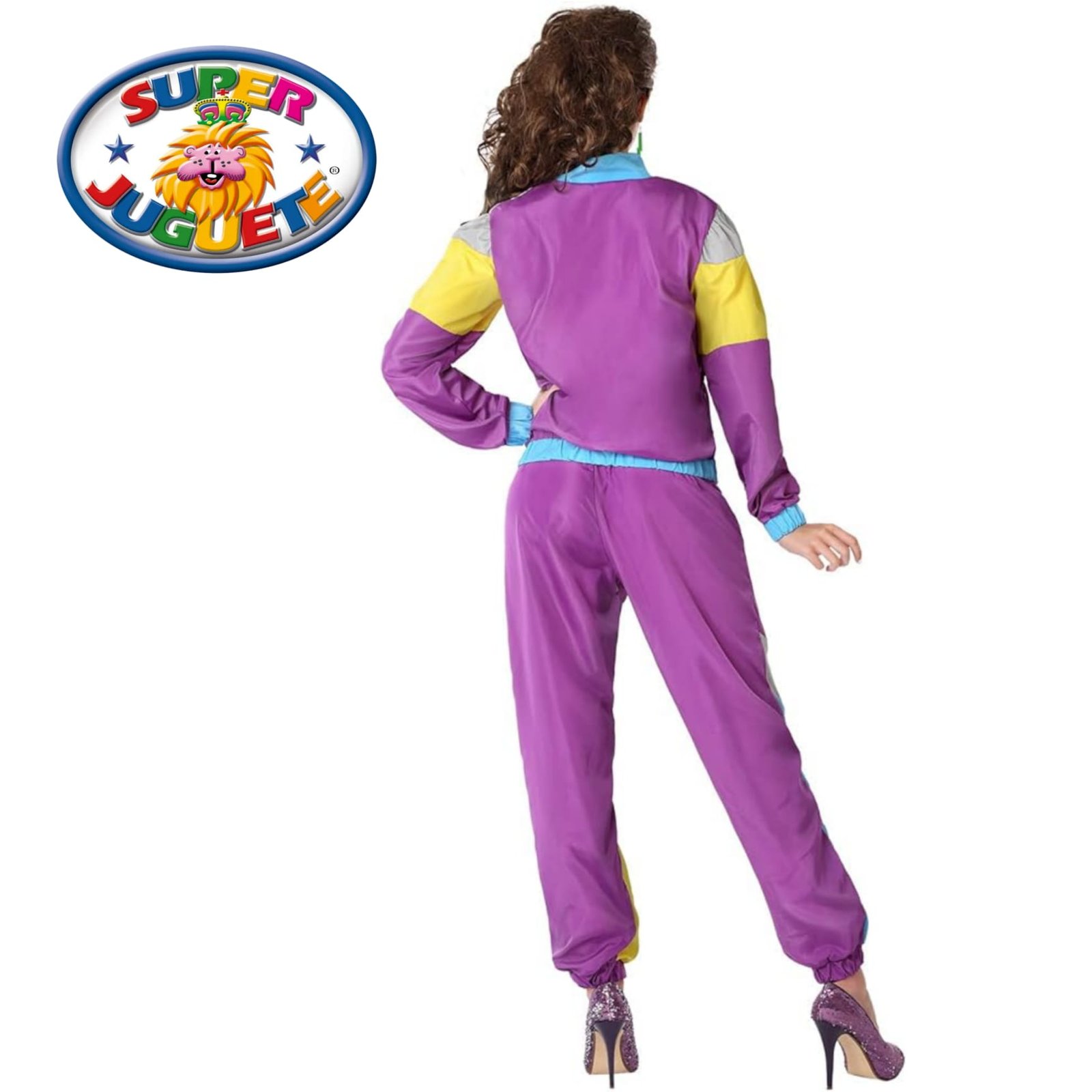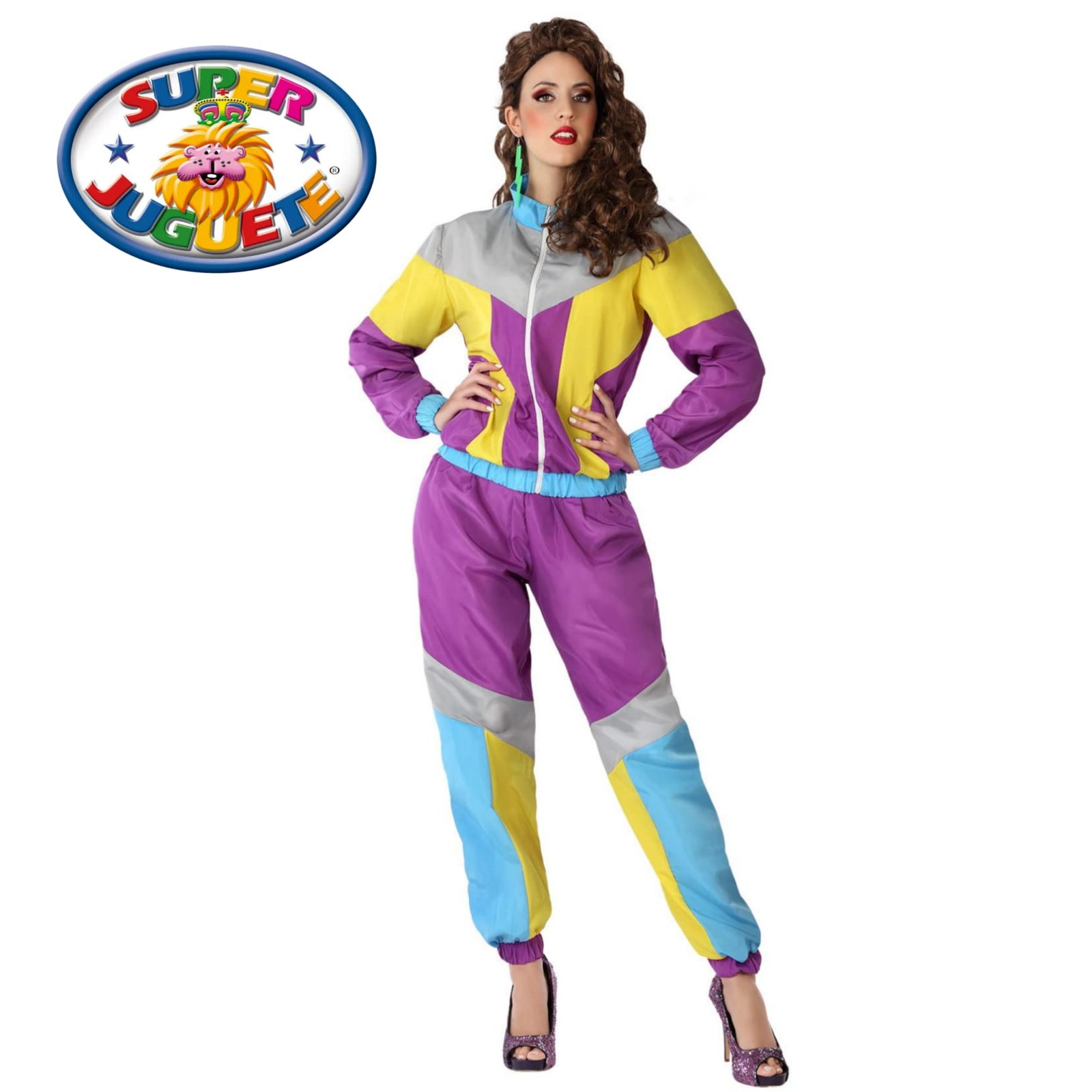 Disfraz retro de chándal años 80 multicolor para adulto. Cómodo, llamativo e inclusivo. Ideal para carnaval, fiestas temáticas y eventos ochenteros. ¡No necesita pilas!