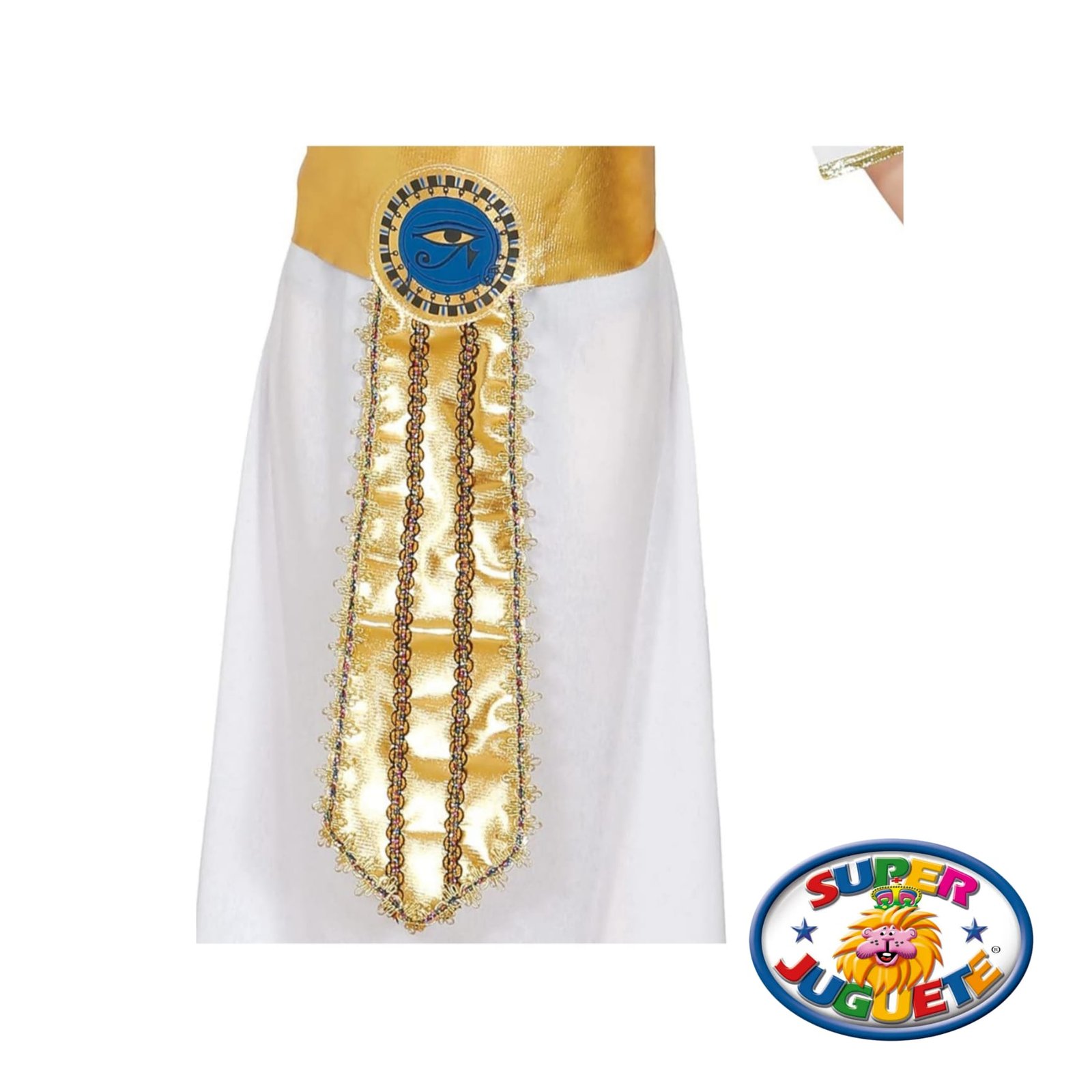 Disfraz infantil de Cleopatra con vestido blanco y detalles dorados. Ideal para Carnaval, Halloween y fiestas temáticas. Cómodo, inclusivo y sin pilas.