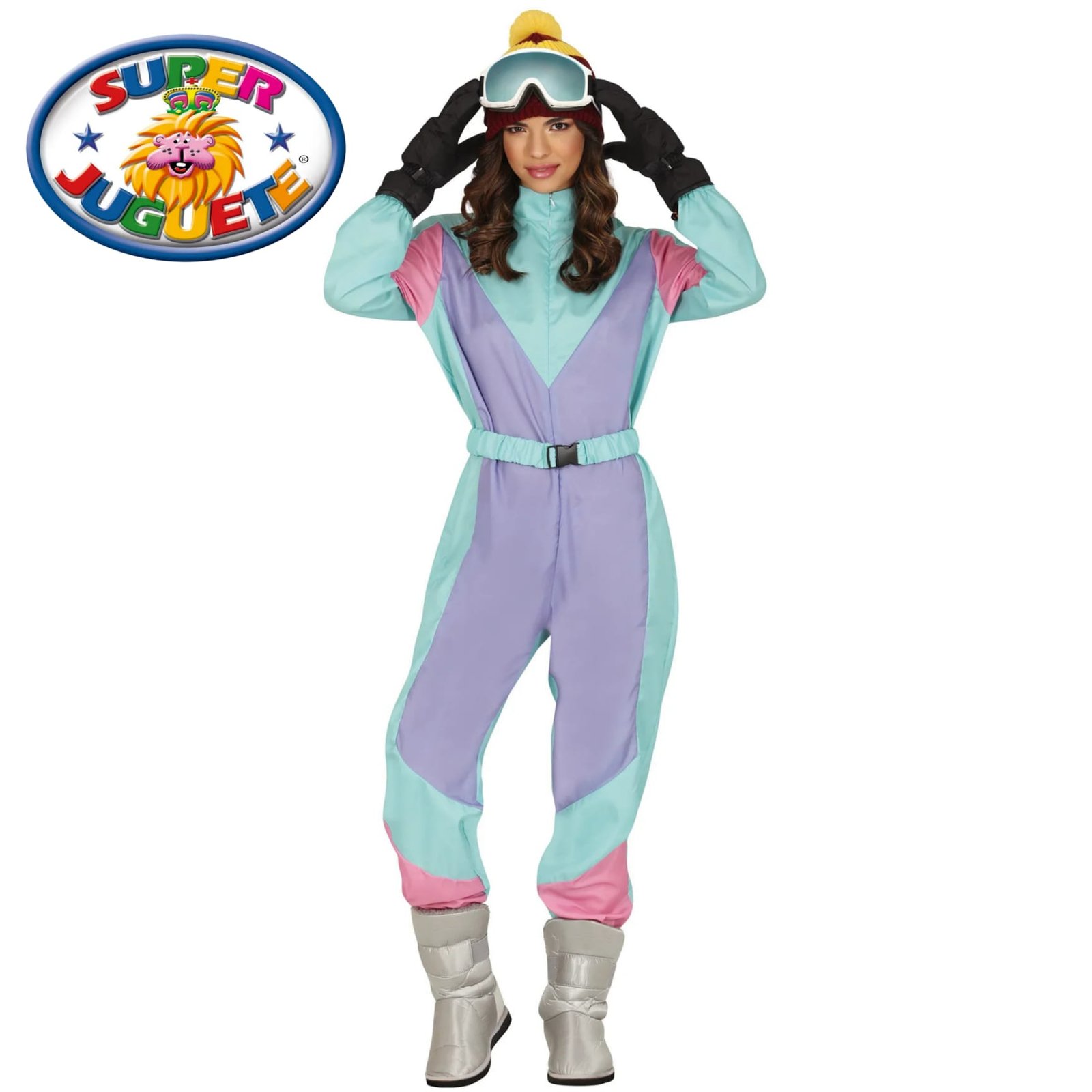 Este disfraz de esquiadora retro para mujer combina colores pastel irresistibles (lila, verde menta y rosa) con un diseño deportivo vintage que grita après-ski ochentero. Perfecto para destacar en Carnaval, fiestas temáticas o eventos retro con mucho estilo ❄️✨
