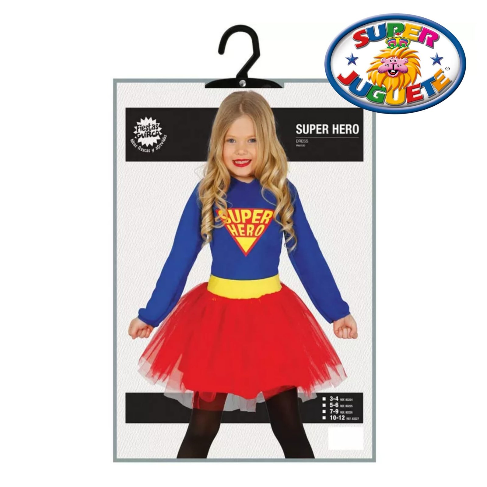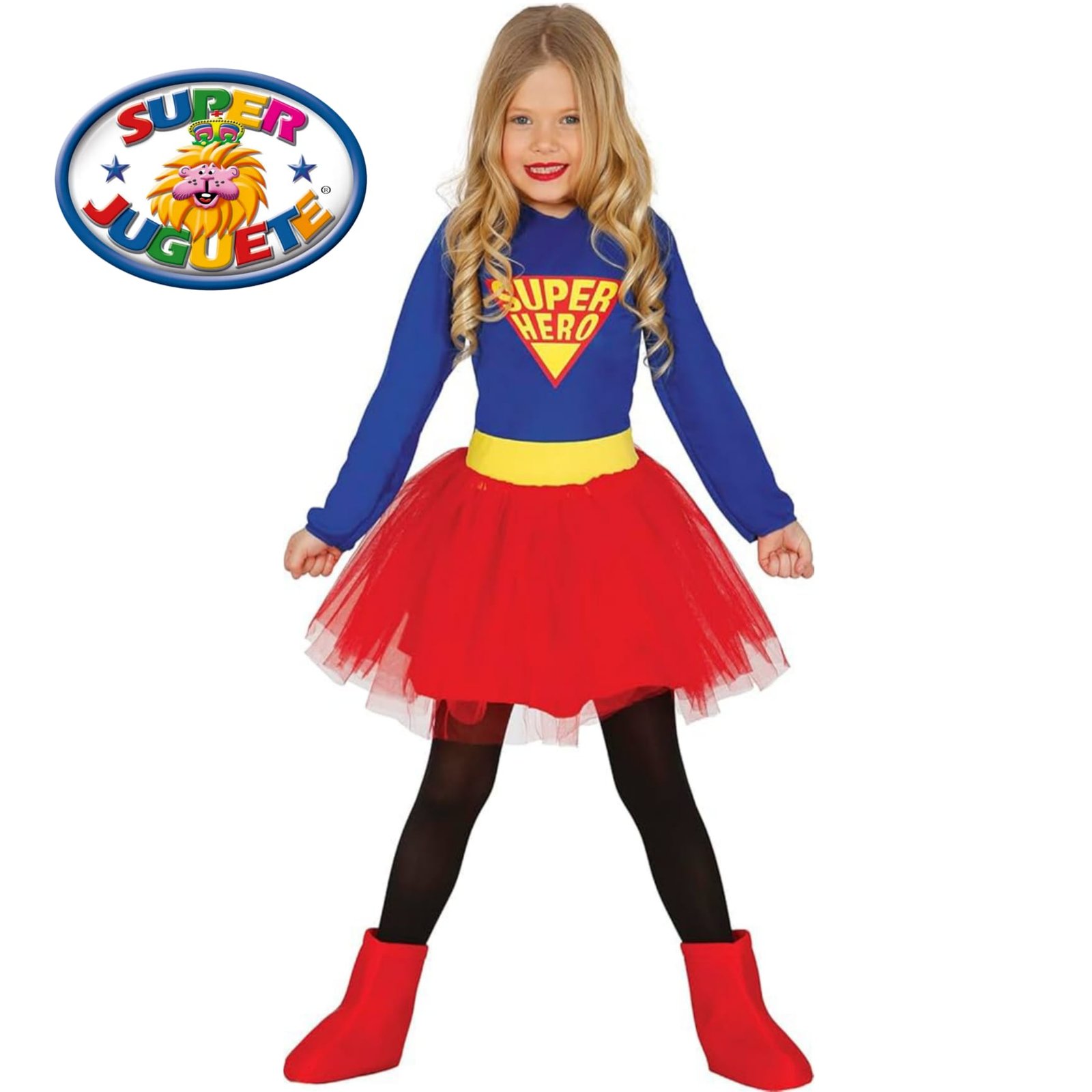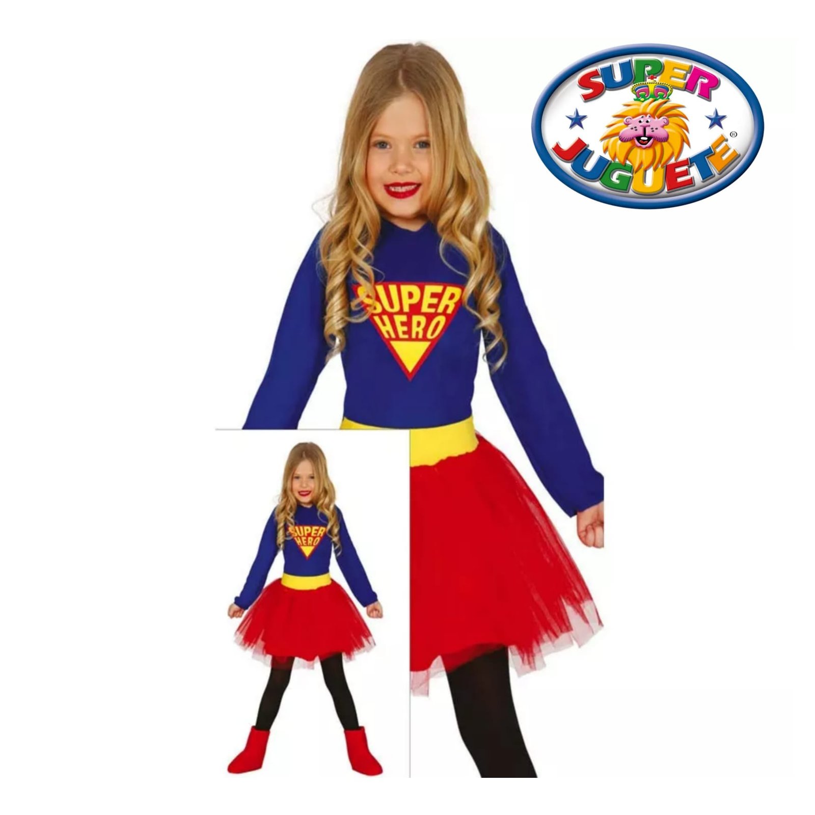 Incluye un vestido azul con emblema “Super Hero”, una falda roja de tul con cinturilla amarilla que da un toque mágico y divertido, ideal para girar, saltar y salvar el día 💫🦸‍♀️