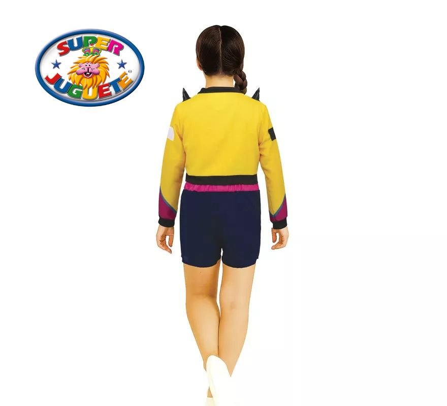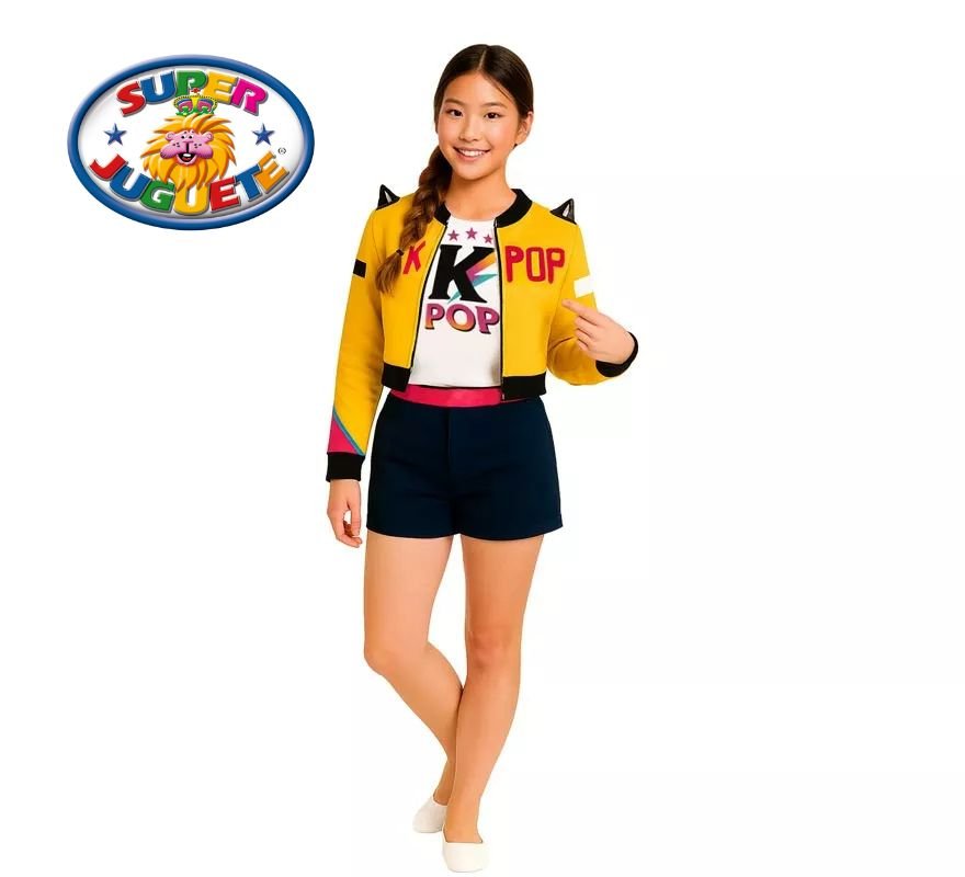 Disfraz K-Pop para niña con cazadora amarilla, camiseta estampada y short azul. Ideal para carnaval, fiestas y actuaciones. Colorido, cómodo y moderno.
