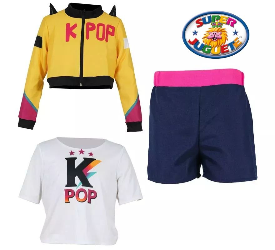 Incluye una cazadora corta amarilla con detalles llamativos, una camiseta con estampado K-Pop y un short azul con cintura rosa, creando un look urbano y divertido que no pasa desapercibido. 🎶💥