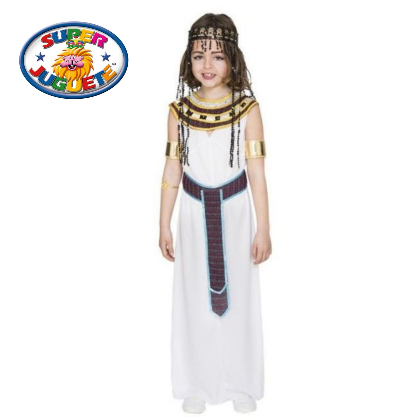 Disfraz de egipcia infantil con vestido largo, diadema y brazaletes. Ideal para Carnaval, Halloween y fiestas temáticas. No necesita pilas.