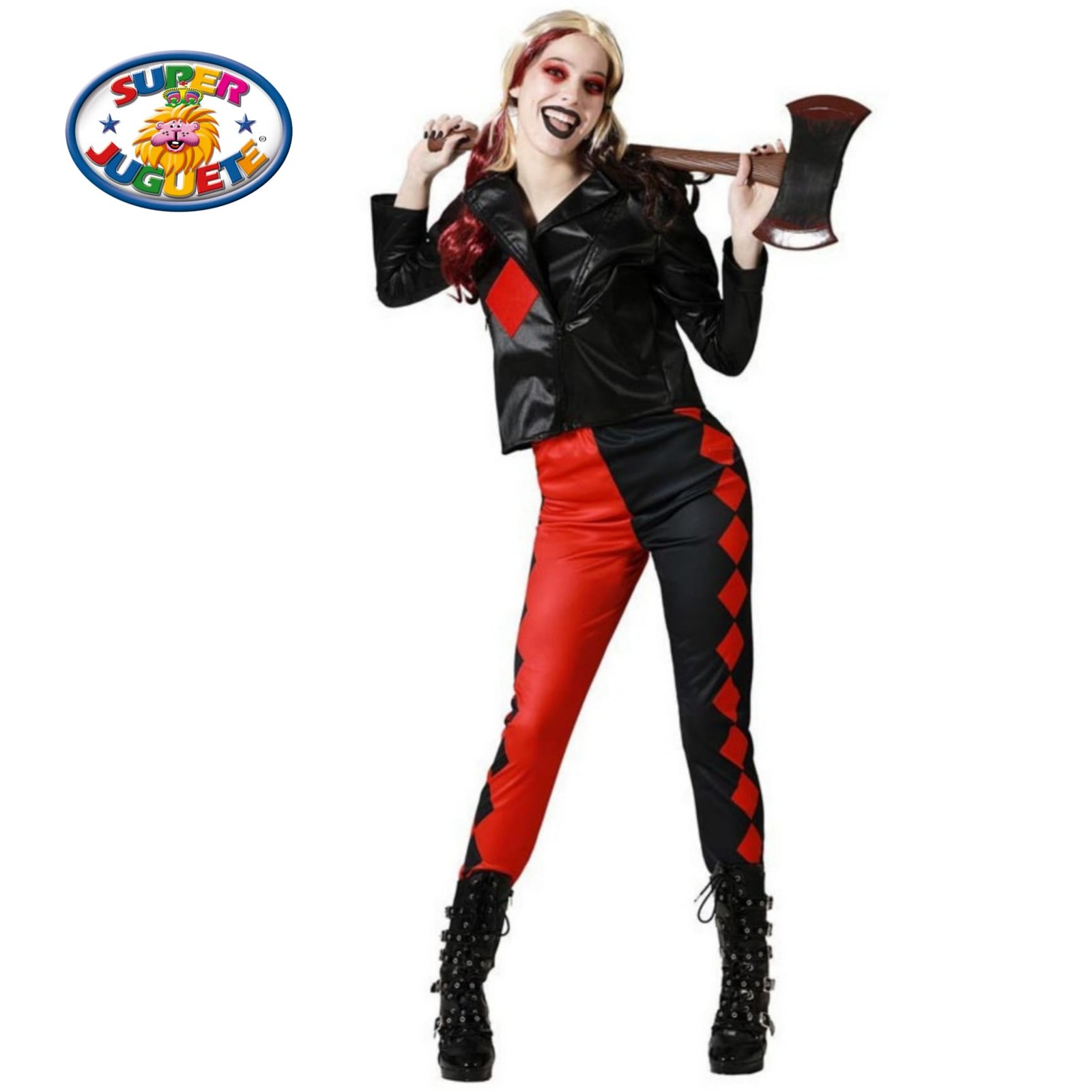 Disfraz de villana traviesa para mujer. Incluye chaqueta y pantalón negro/rojo estilo rebelde. Ideal para Halloween, cosplay y fiestas temáticas. No necesita pilas.