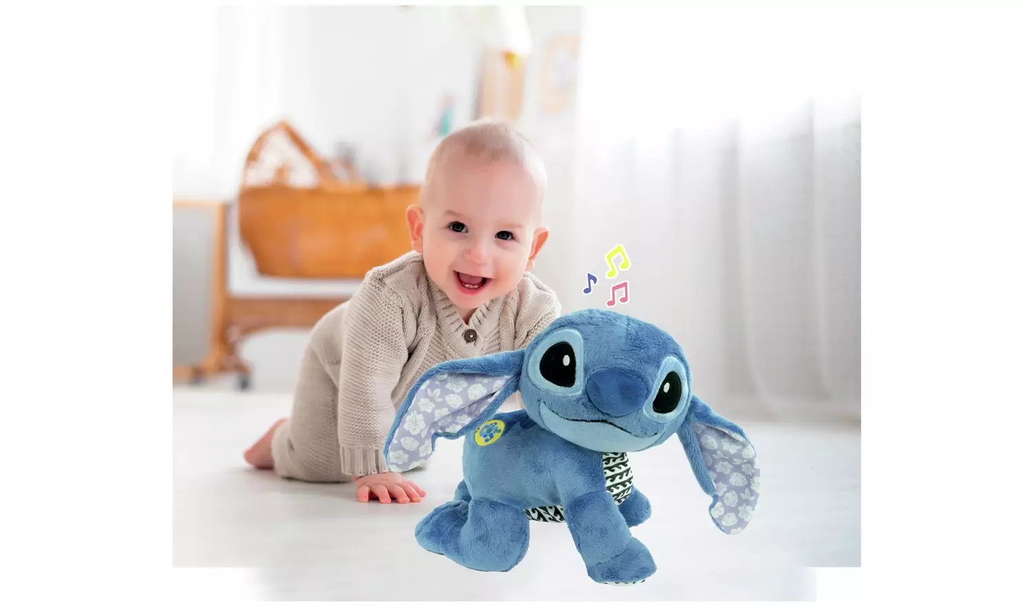 Con movimientos reales, música y sonidos, Stitch gatea, canta y estimula la curiosidad de los más pequeños 💫