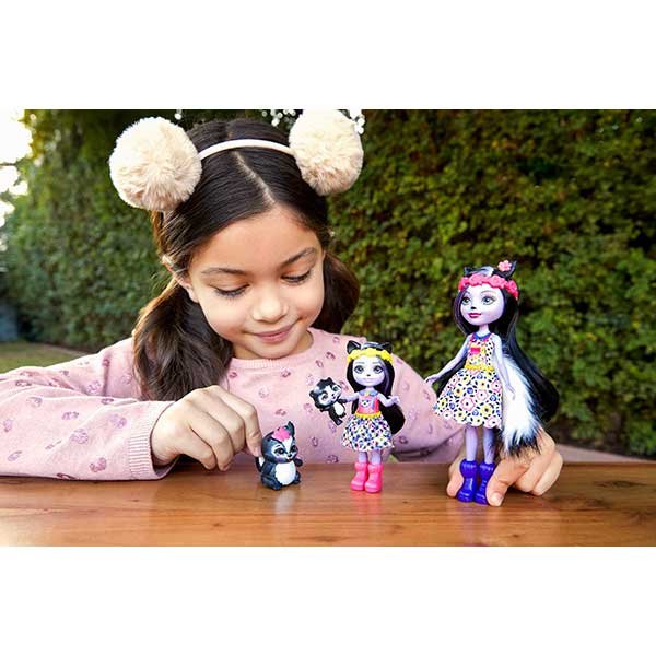 Muñecas hermanas Sage Skunk y Sabella Skunk (15 y 10cm) y 2 figuras de animales de Enchantimals, con accesorios y falda de quita y pon, un gran regalo para niñas a partir de 3 años.