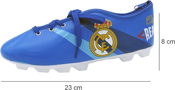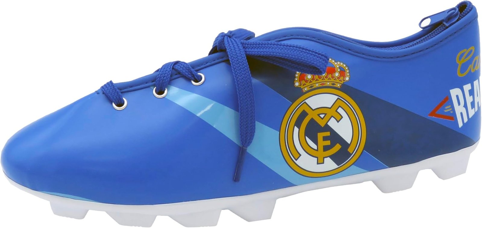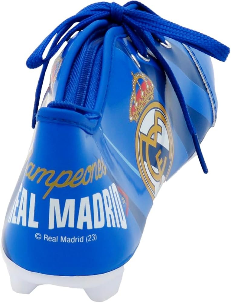 Estuche del Real Madrid con forma de bota de fútbol en color azul. Portatodo original con cremallera, sin pilas, ideal para fans y uso escolar.