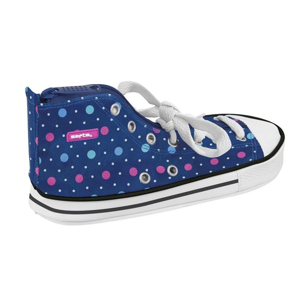 Original estuche escolar con forma de zapatilla. Cierre con cremallera. Estampado de lunares sobre fondo azul. Fabricado en Poliester. Con la garantía de Safta.