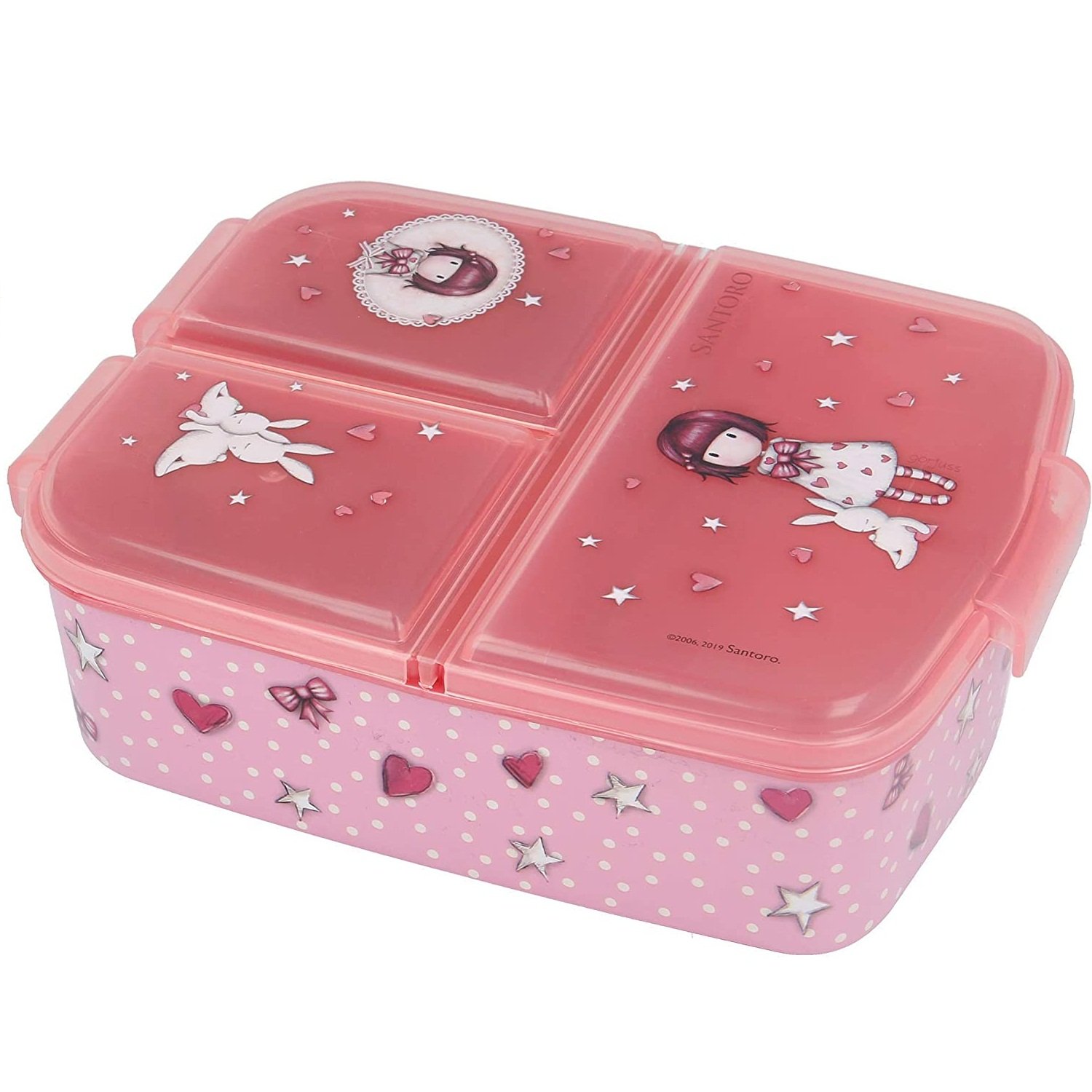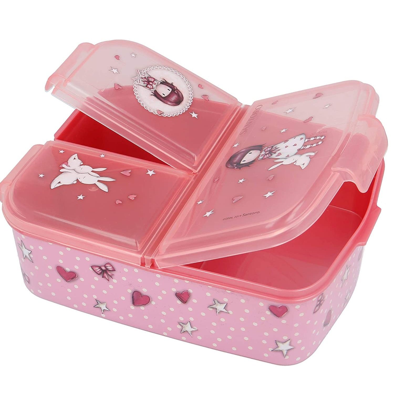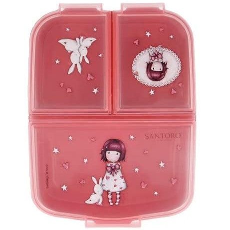 Práctica sandwichera infantil para que los niños lleven su almuerzo o merienda cómodamente en sus salidas fuera de casa. Gracias a sus tres compartimentos se pueden almacenar distintos tipos de alimentos sin que éstos se mezclen.