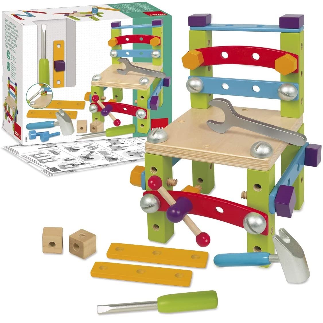 Un sistema de la construcción de el cual es posible construir 7 modelos diferentes. Incluye 37 piezas de madera, 3 herramientas con bordes redondeados y 1 guía de construcción con 7 modelos para hacer.