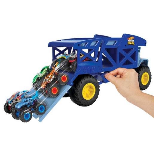 Puede contener 12 Monster Trucks a escala 1:64 o 32 vehículos Hot Wheels a escala 1:64 (no incluidos) y también cuenta con una rampa desplegable en la parte trasera que puede poner en acción los coches de juguete (cada auto se vende por separado).