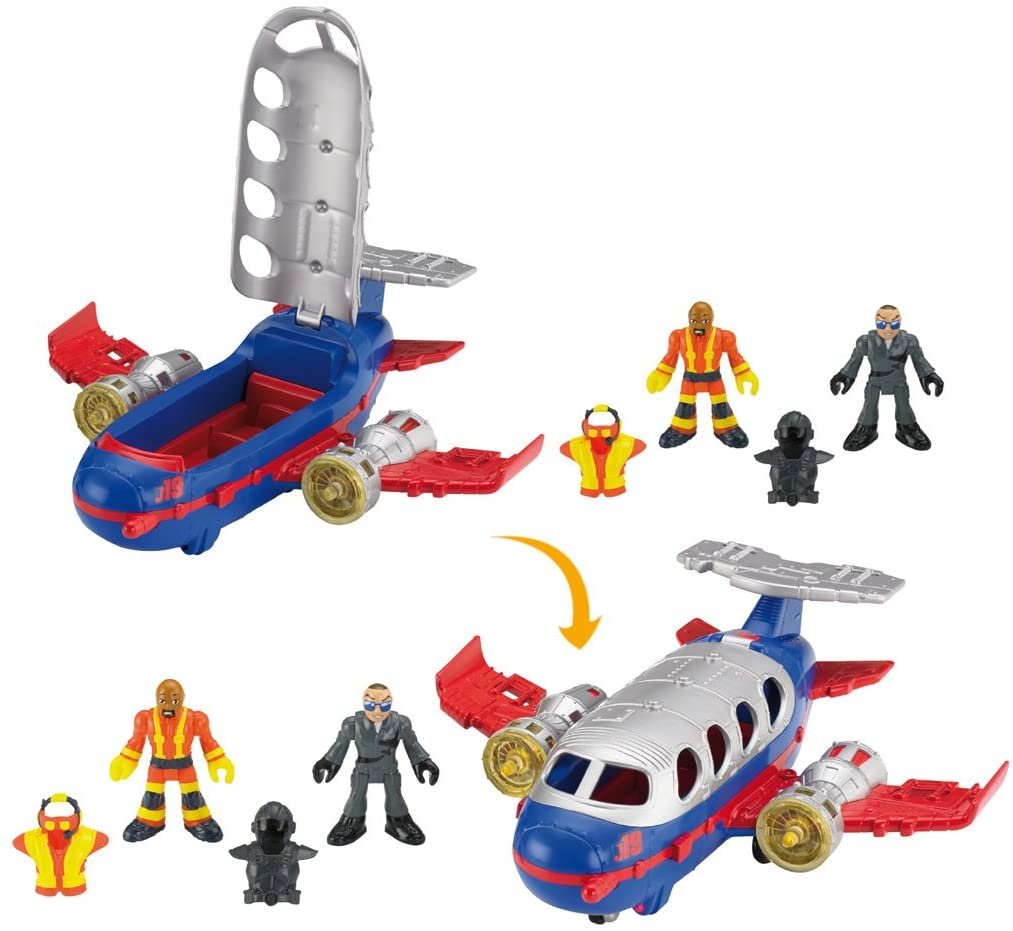 Este gran avión de rescate con tecnología ActionTech tiene cuatro luces, emite sonidos y habla. Con su tren de aterrizaje mecánico y una cubierta que se abre para colocar tres figuras en su interior, ¡este avión está preparado para la aventura! También incluye un piloto y un trabajador del personal de tierra con casco.