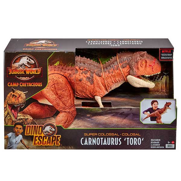 Prepárate para vivir emociones fuertes y aventuras con Jurassic World Dino Escape! Inspirada en la serie Jurassic World: Campamento Cretácico, la figura Carnotaurus «Toro» Supercolosal viene en un tamaño ENORME y puede ENGULLIR MINI FIGURAS DE ACCIÓN ENTERAS.
