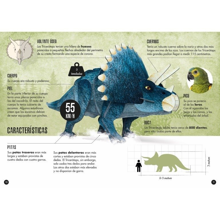 Un libro de 32 páginas dedicado a los dinosaurios y un modelo 3D detallado del Triceratops.