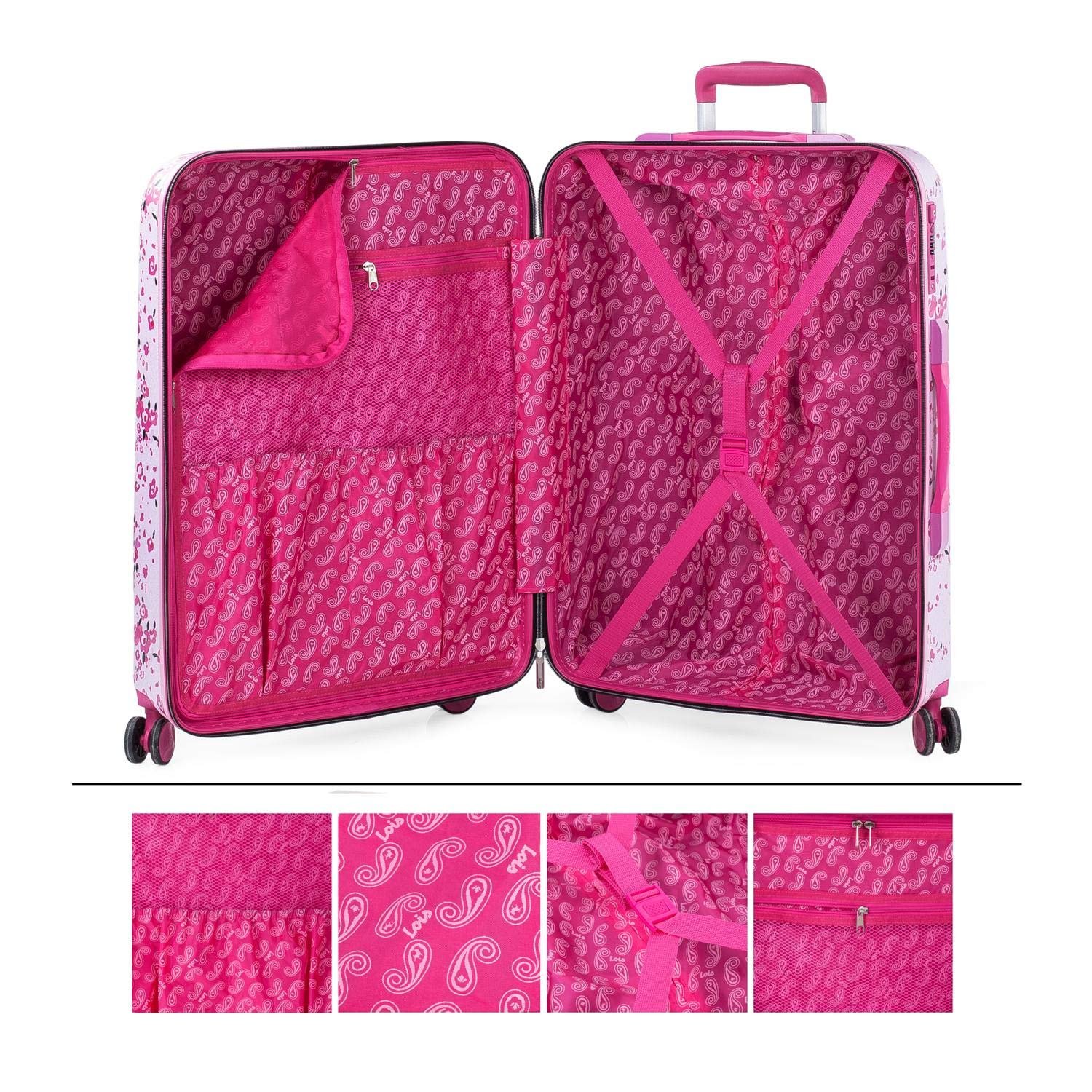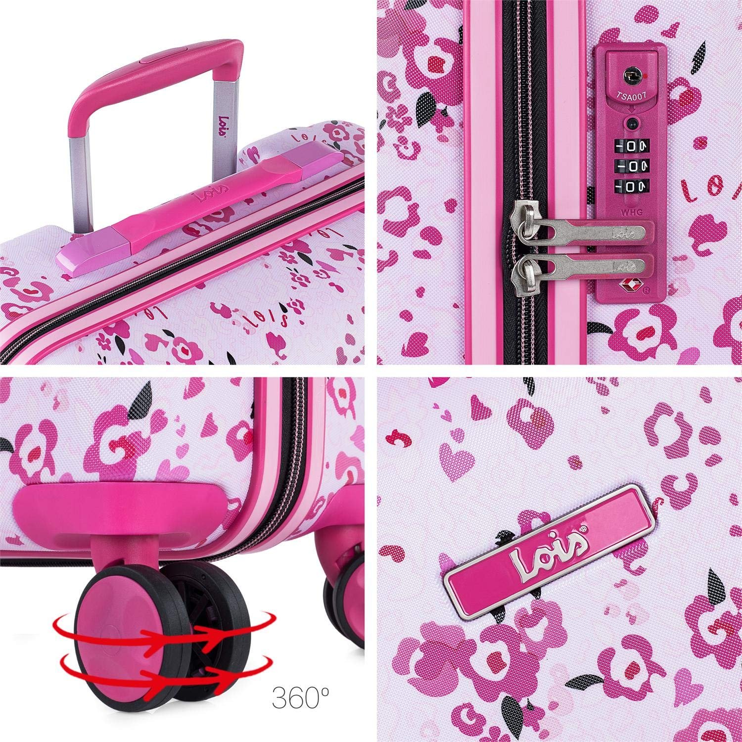 Caracteríticas principales: Maleta de cabina de la marca Lois realizadas con ABS texturizado y estampado, un material ligero y a la vez resistente. Otra ventaja que presenta son sus 4 ruedas dobles giratorias 360°, permitiendo un desplazamiento fácil, suave y sin esfuerzo. La cerradura con combinación TSA, garantiza tu tranquilidad por la homologación internacional. La cremallera con doble cursor facilita su apertura y manejo. En su interior, el forro se ha personalizado con el logo de la marca, acorde con el diseño exterior, cuenta con separación central y bolsillo neceser para los objetos más pequeños. Las correas elásticas interiores garantizan la sujeción correcta del equipaje.