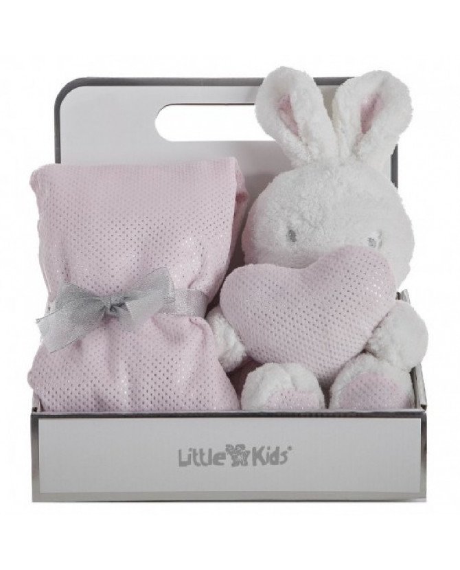 Adorable set con manta y peluche de conejo incluido es en blando y rosa, podrás tapar a tu bebe con esta dulce mantita de 75 x75cm de doble cara, en sus sueños má dulces estara acompañado de un conejito suave.