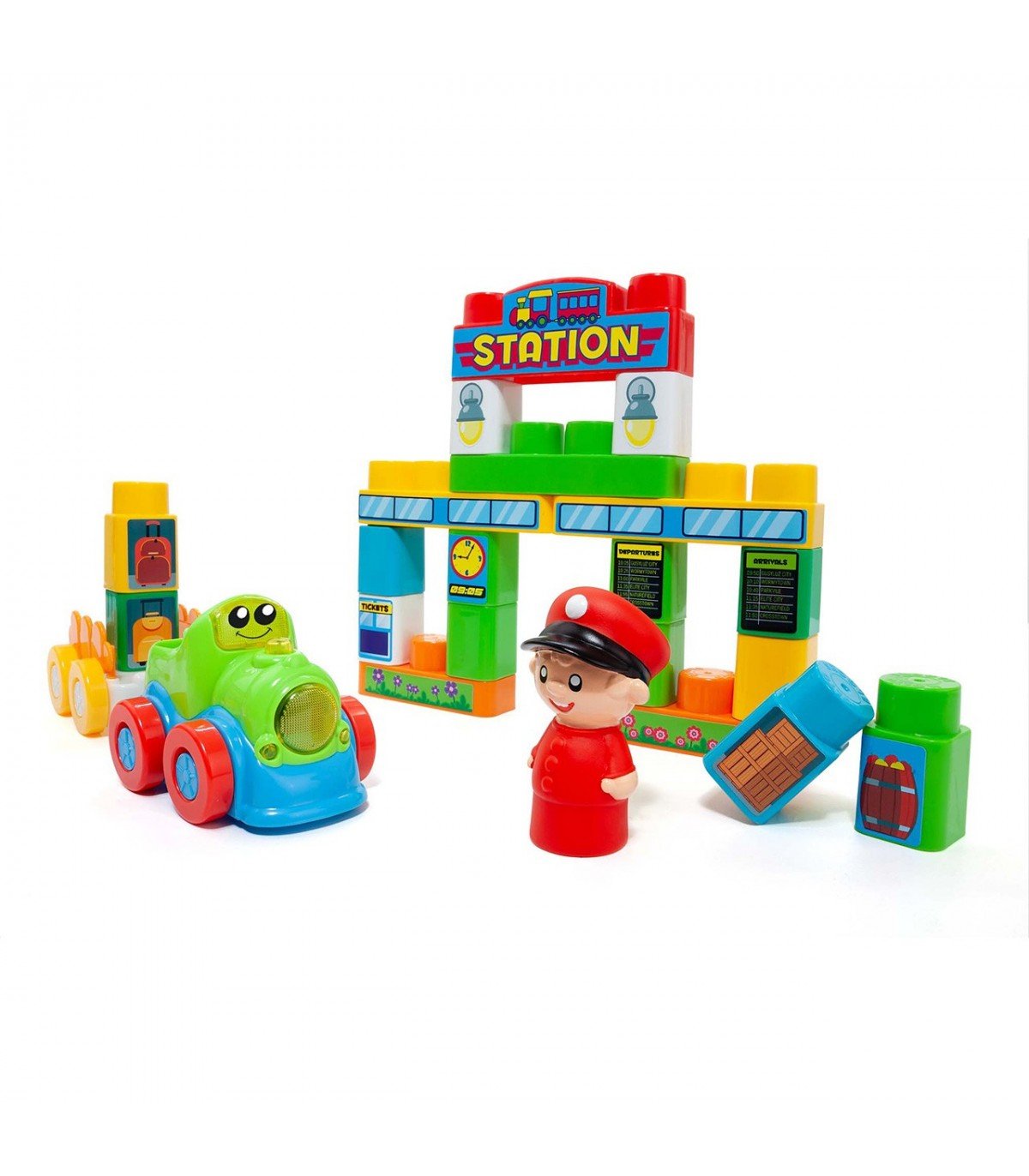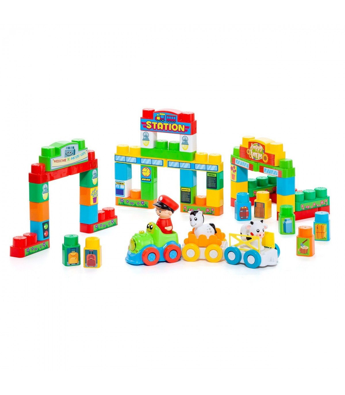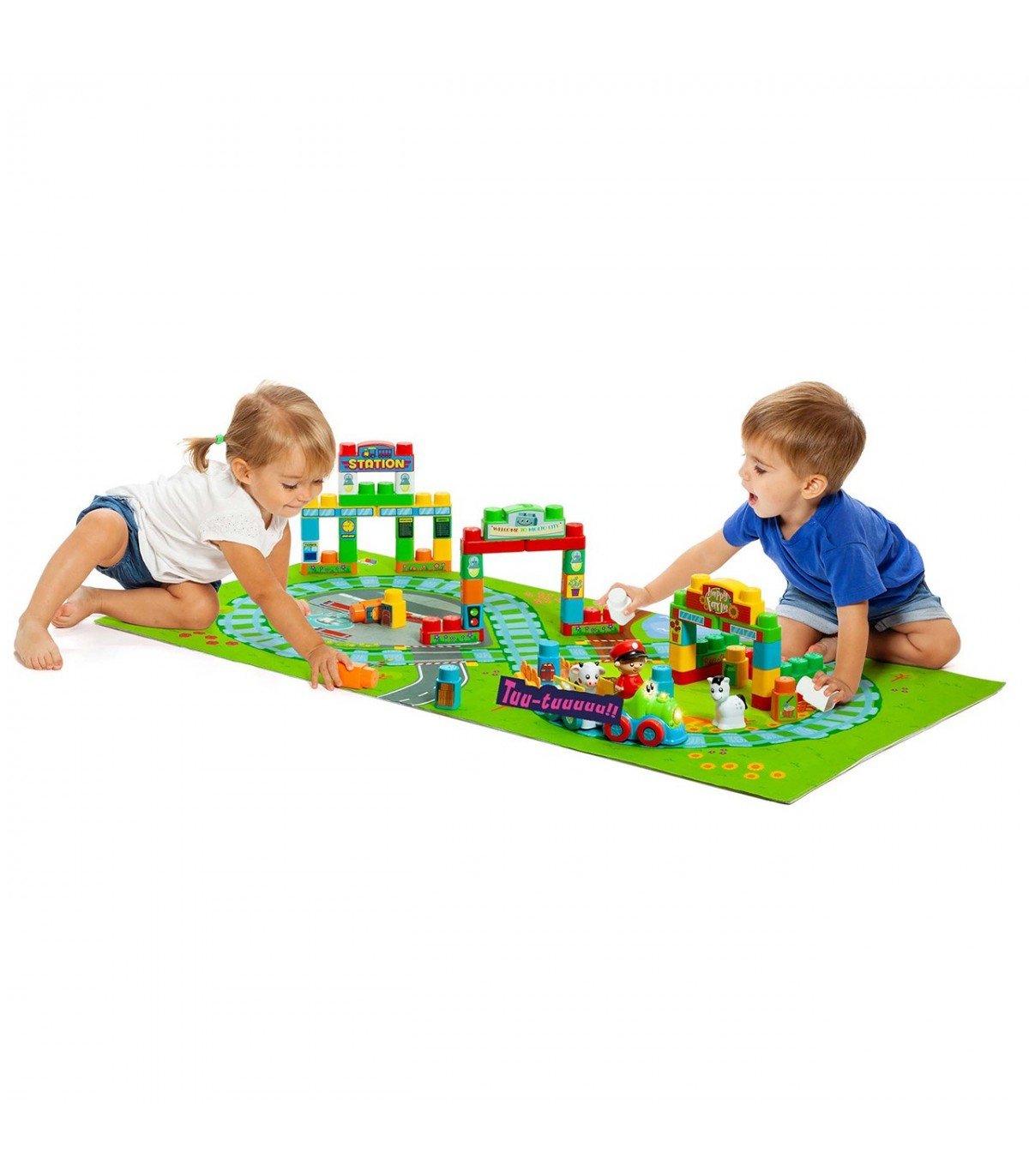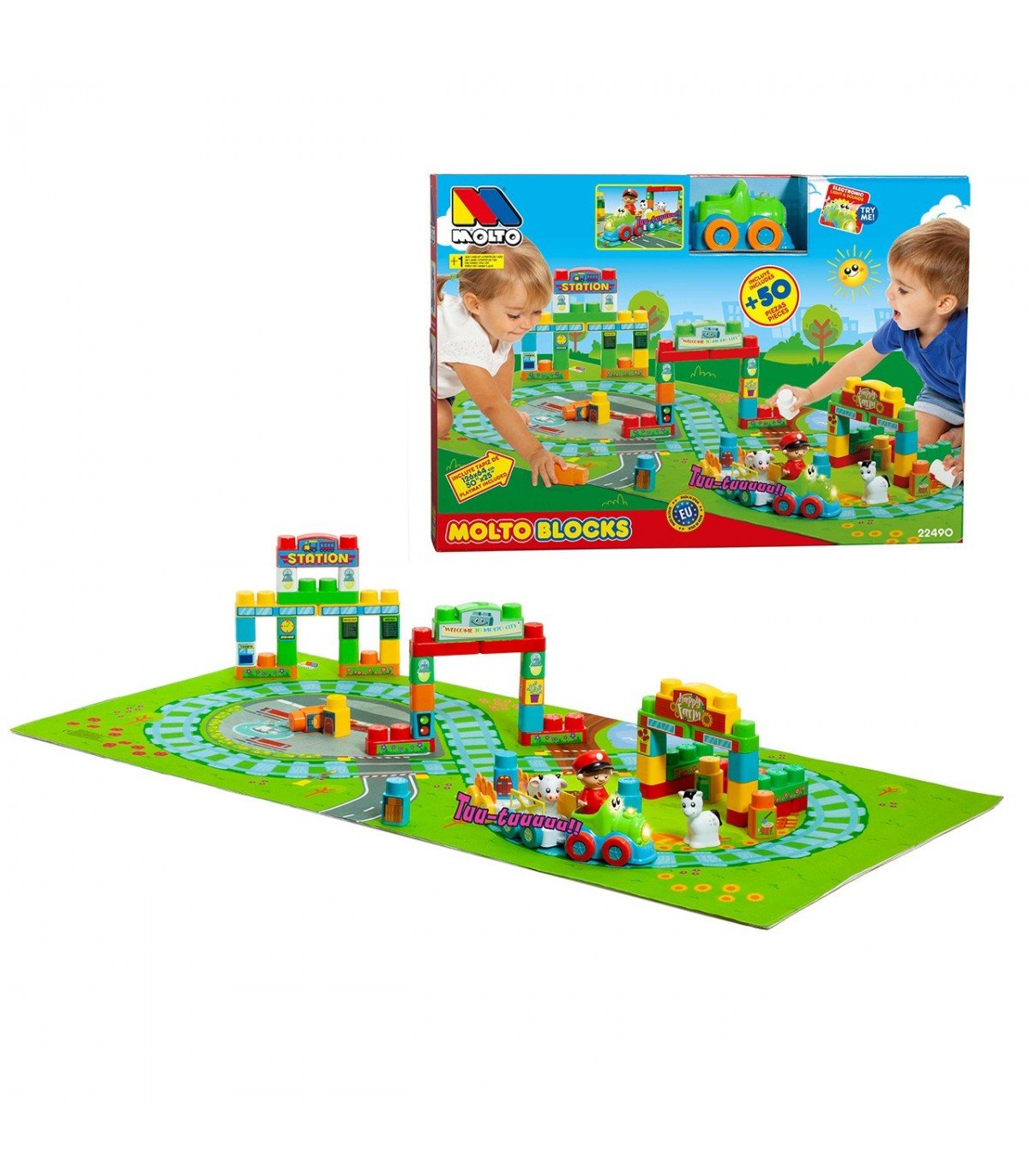 MOLTO BLOCKS TREN ELECTRÓNIICO + TAPIZ ¡BIENVENIDO A MOLTO CITY! ESTA PEQUEÑA CIUDAD INCLUYE 50 PIEZAS CON LAS QUE PUEDEN DAR RIENDA SUELTA A SU IMAGINACIÓN. ADEMÁS INCLUYE UN TREN CON MULTITUD DE SONIDOS.