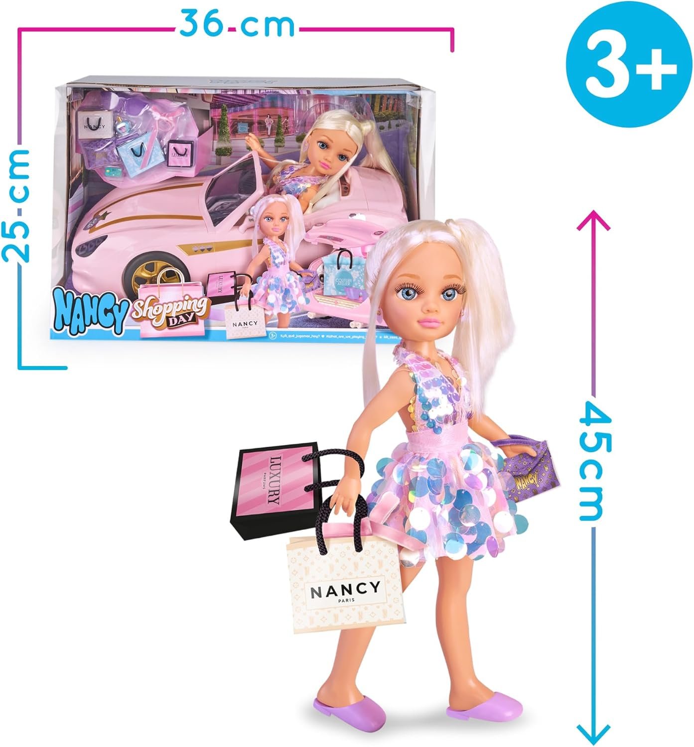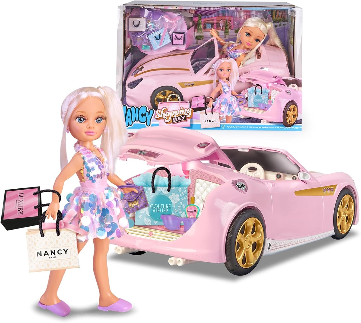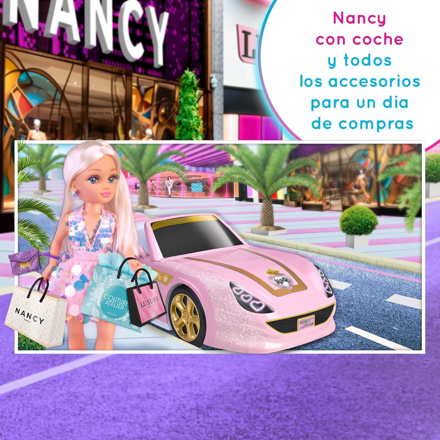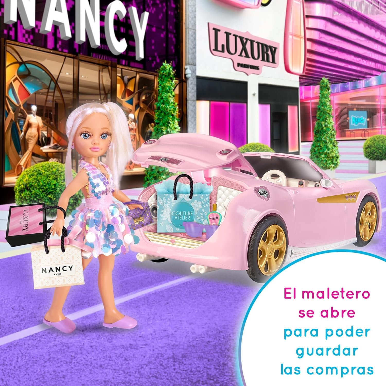 Prepárate para un día lleno de moda, diversión e imaginación con Nancy Shopping Day, el set perfecto para peques que aman crear historias ✨. Nancy llega con su coche rosa súper elegante, detalles dorados y un maletero que se abre para guardar todas sus compras del día 🛒💖.