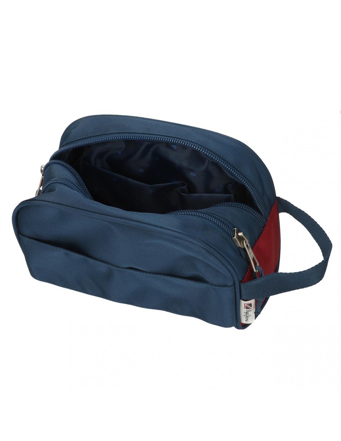 El neceser de viaje Pepe Jeans Chest está fabricado en poliéster en una combinación de rojo oscuro con azul marino y presenta en su frontal, como imagen principal, el logo bordado de Pepe Jeans que se completa con otros logos característicos de la marca.
