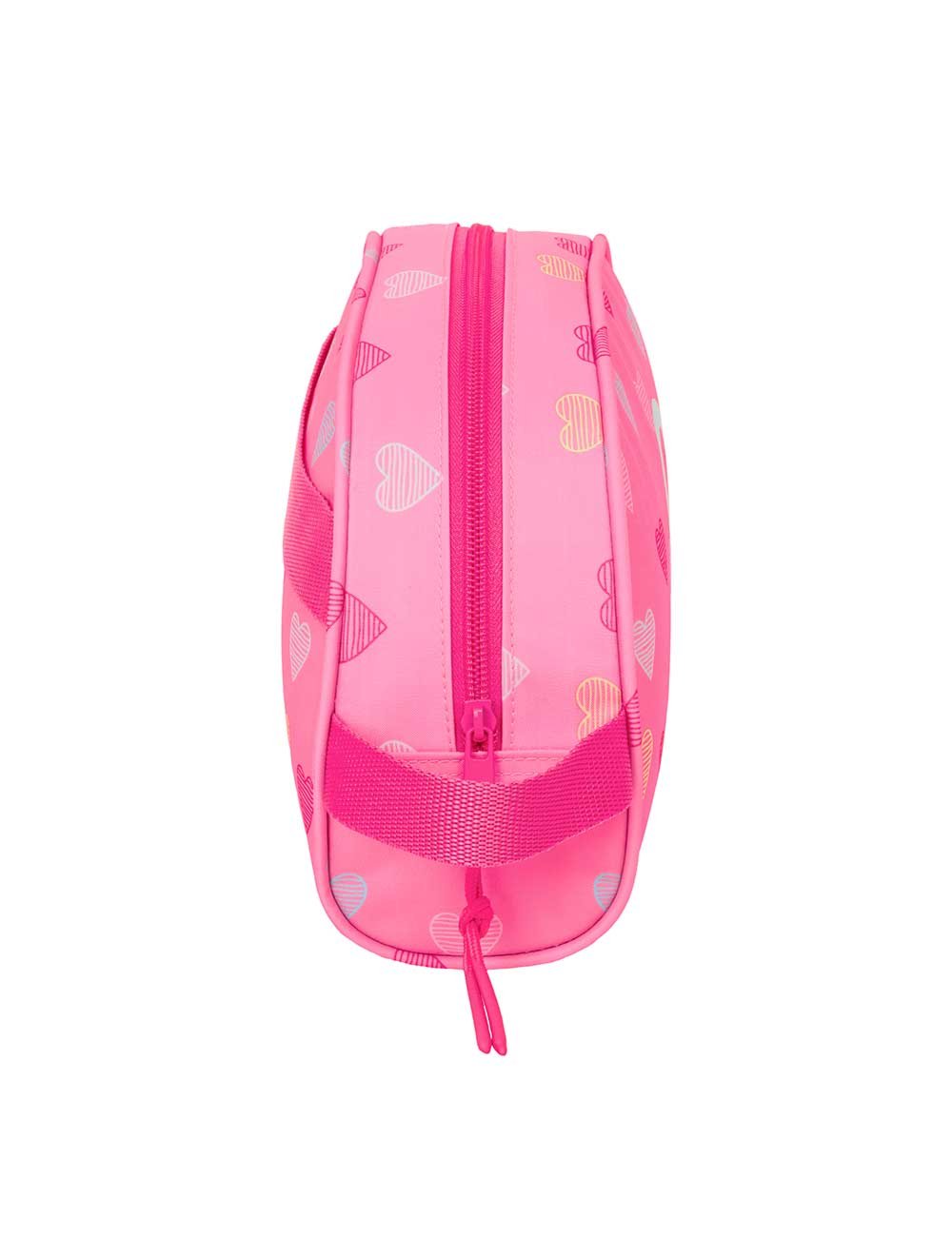 El neceser escolar rosa con estampado de corazones es el complemento perfecto para mantener ordenados los accesorios escolares o personales. Su diseño práctico y moderno lo convierte en una opción ideal para el colegio, viajes o actividades diarias.