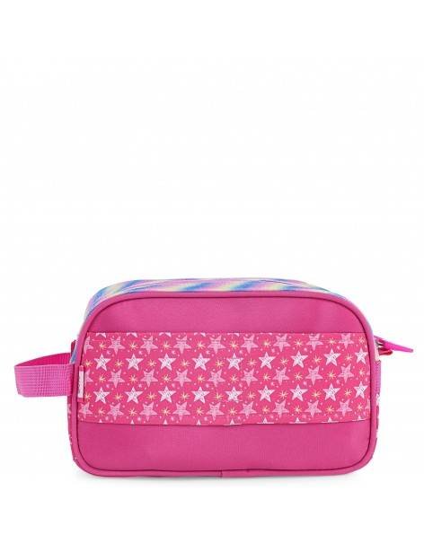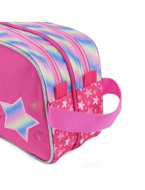 Neceser infantil con un estampado de estrellas, arcoiris, ribeteado en plata con purpurina y detalle de cintas con estrella en el cierre. Tiene un asa, dos compartimentos con cierre cremallera, bolsillo delantero con cremallera y una cinta trasera para llevar en el carro.