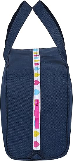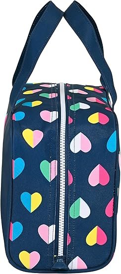 Su formato rectangular estructurado permite organizar cómodamente productos de higiene, maquillaje o accesorios escolares. Dispone de un amplio compartimento principal con cremallera y asas superiores, lo que facilita su transporte tanto en viajes como en el día a día.